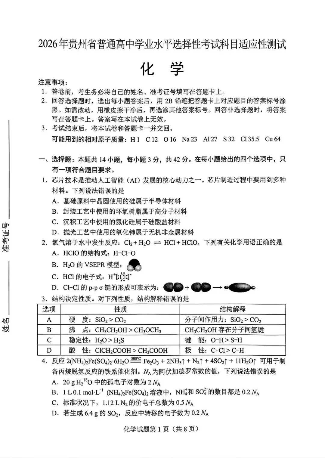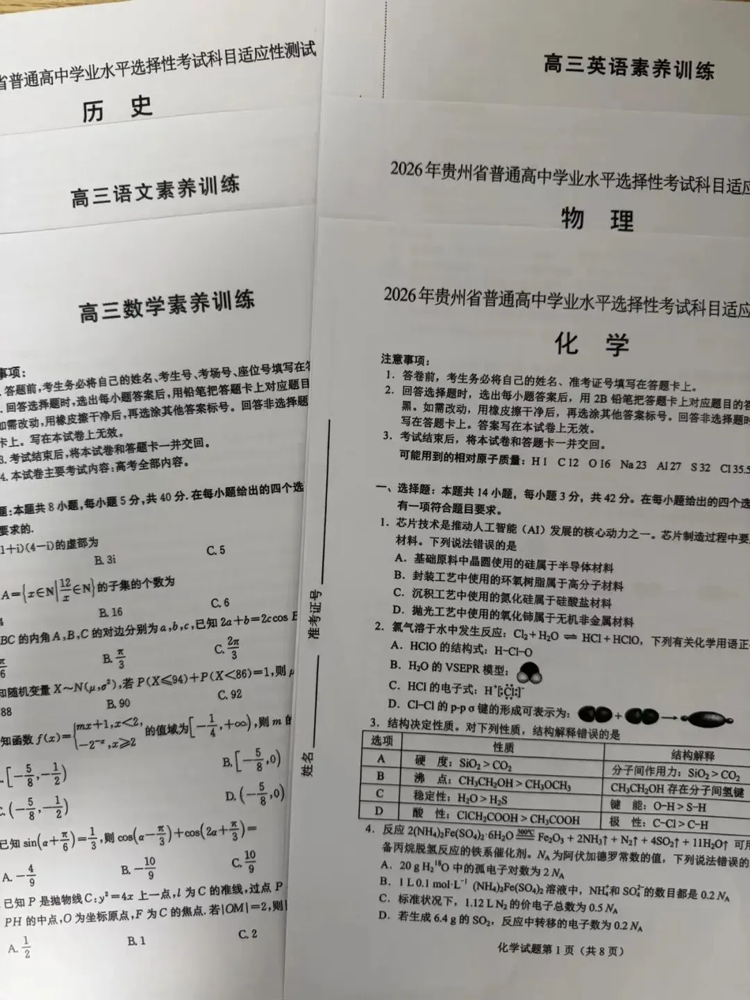 考试名称:2026年贵州省普通高中学业水平选择性考试科目适应性测试