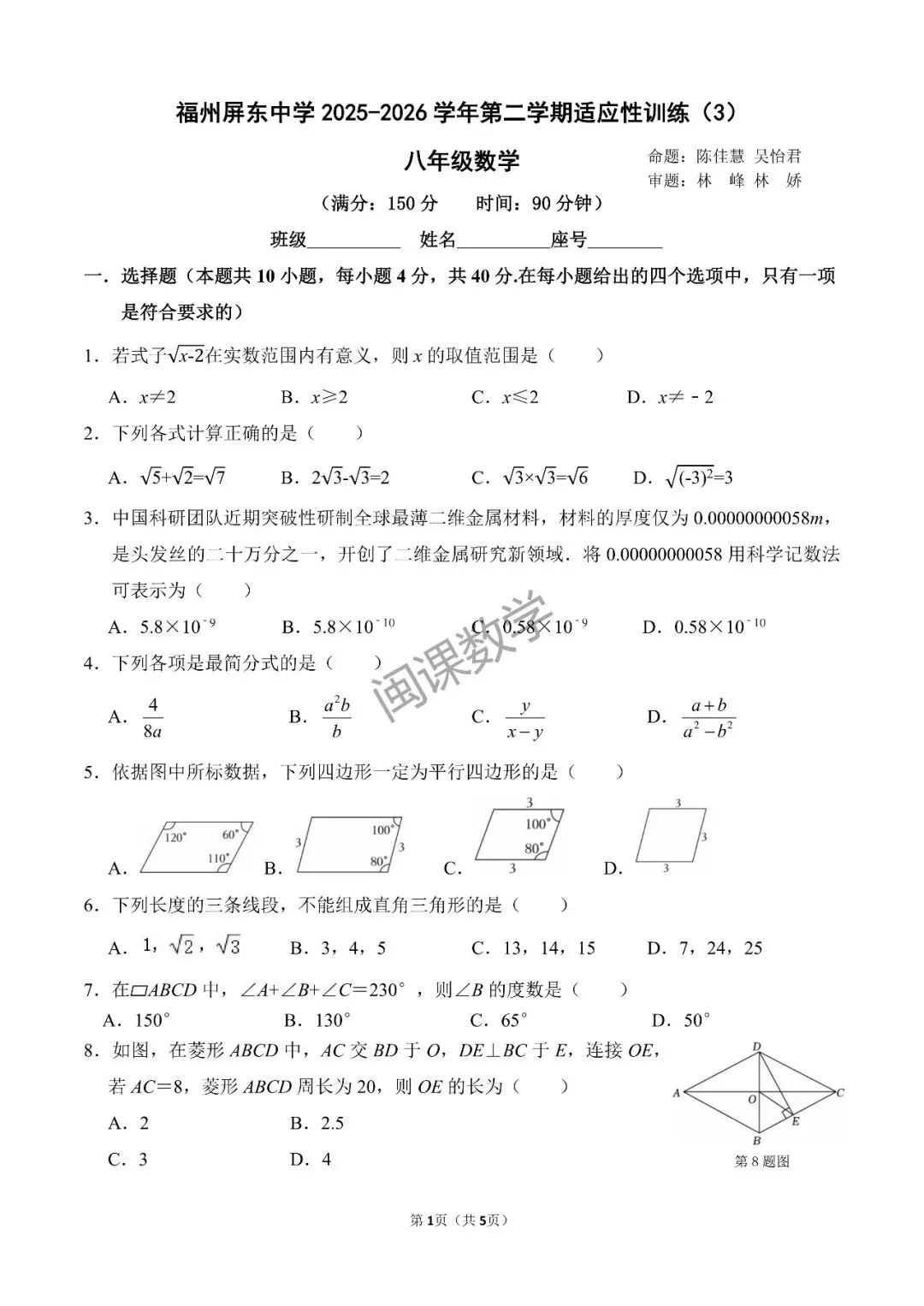 6年【福州屏东中学】试卷:八年级下学期适应性训练数学练习3