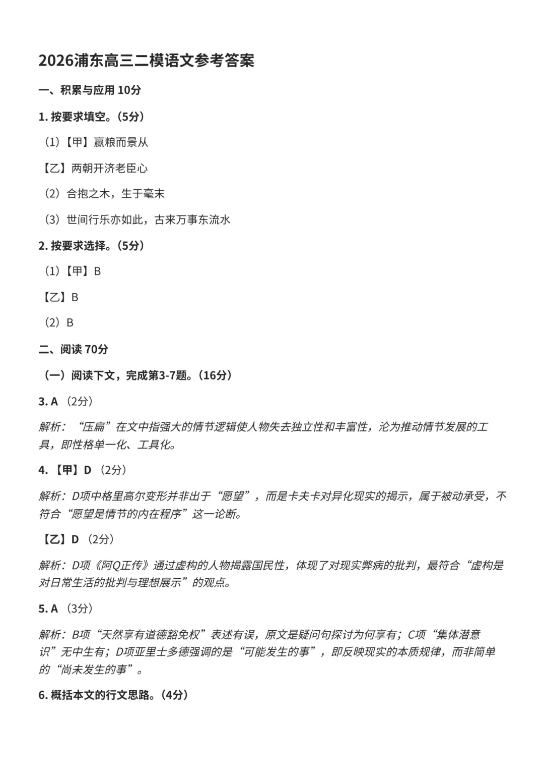 2026浦东高三二模语文试卷及答案分享