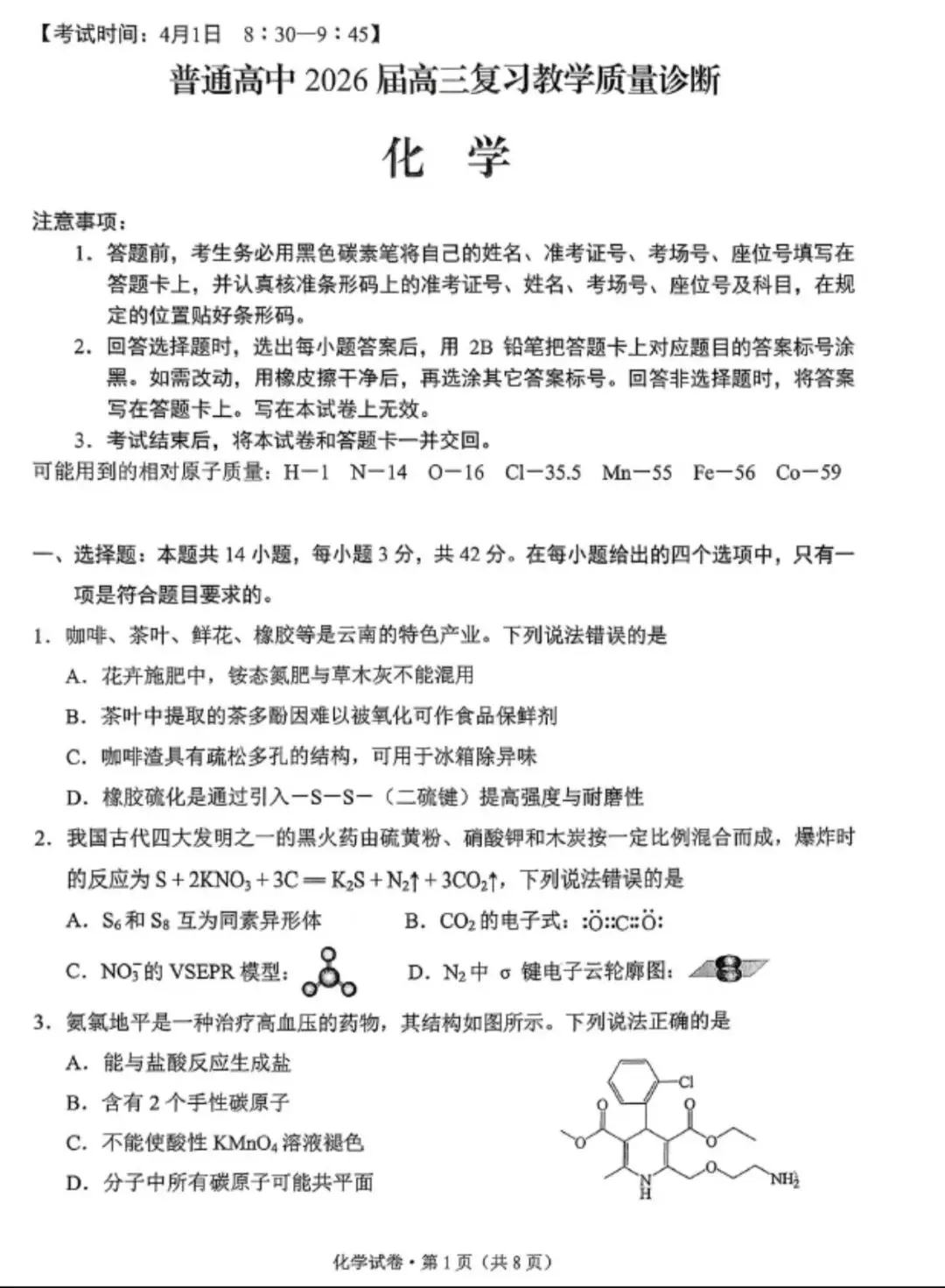 昆明市2026届4月市统测化学试卷及答案
