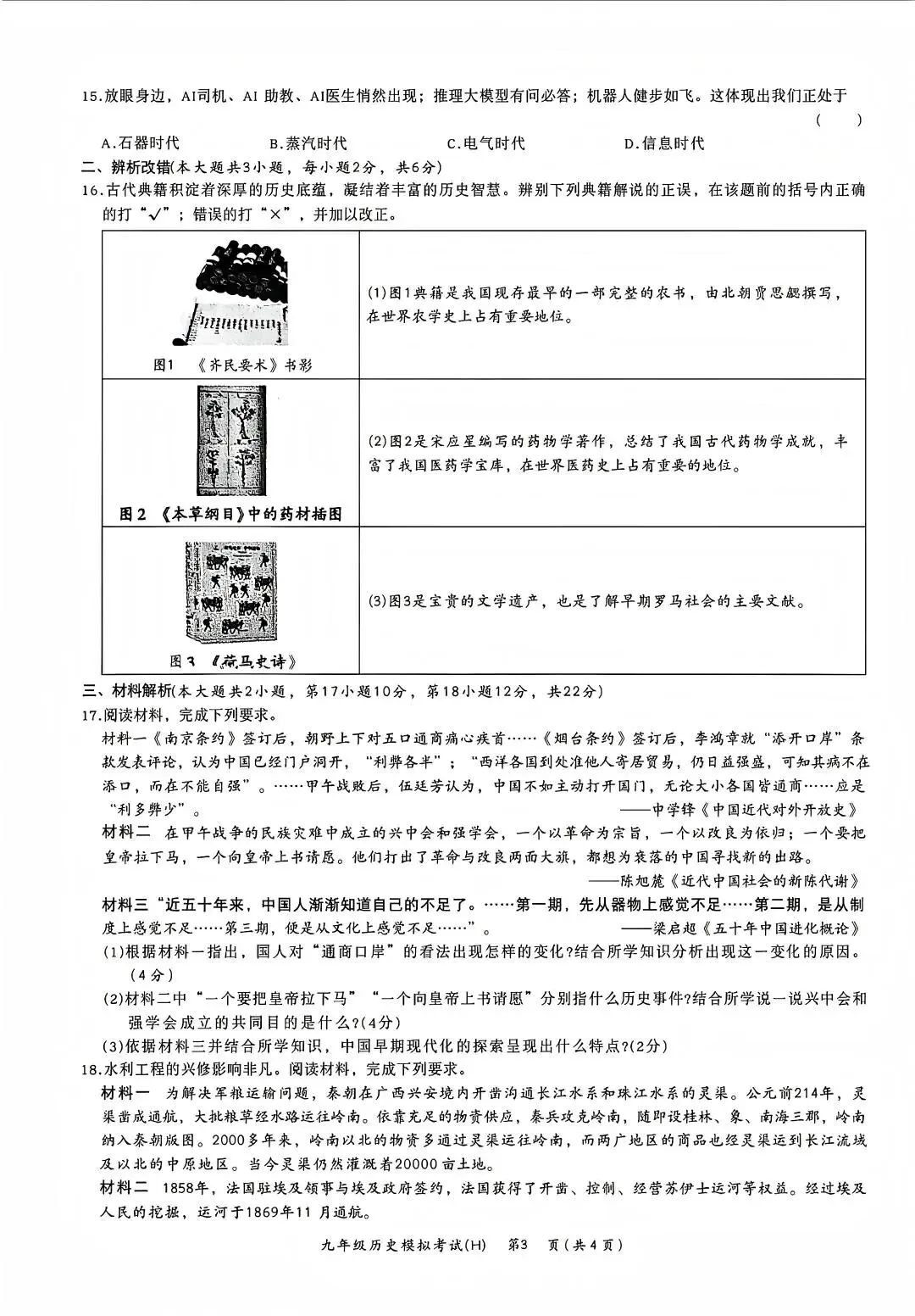>合肥市瑶海区2026中考一模历史试卷+答案
