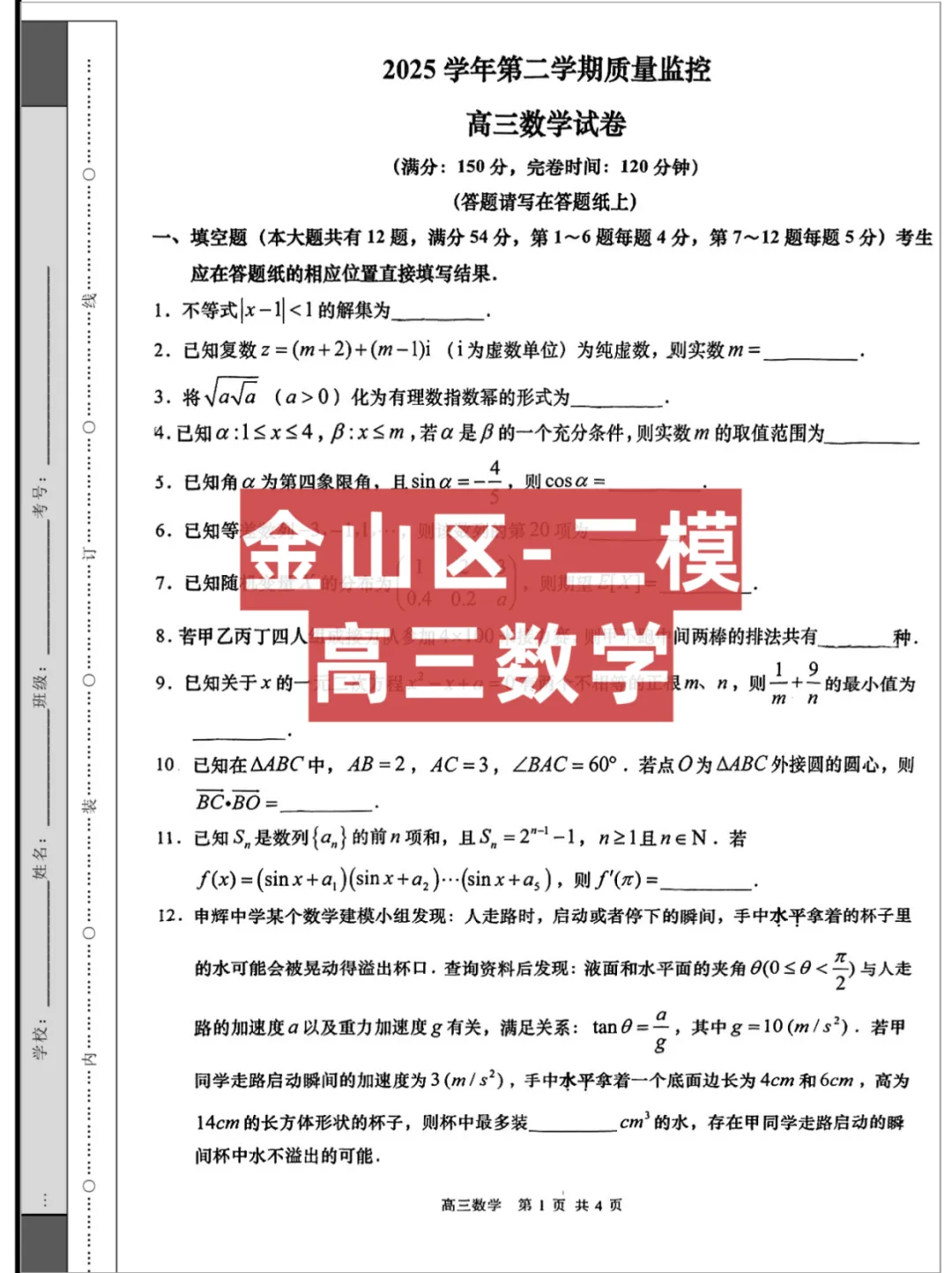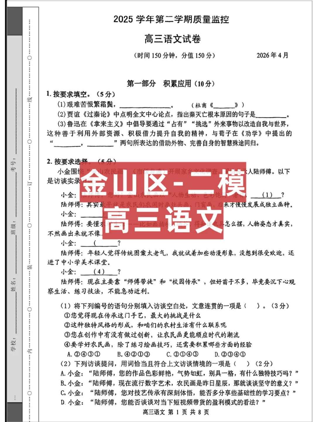 2026 上海金山高三二模贴合高考命题方向,难度题型对标正式统考。全区统一排名精准定位成绩档位,梳理薄弱考点,优化冲刺规划,更是综评、强基报名与高考志愿填报的重要参考依据。