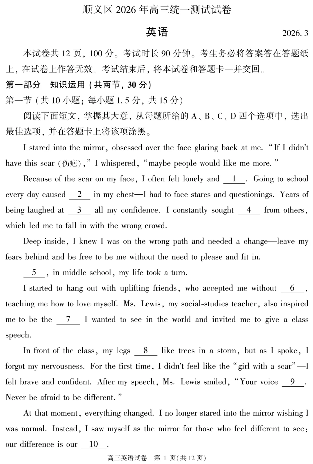 上下文:Because of the scar on my face, I often felt lonely and ____