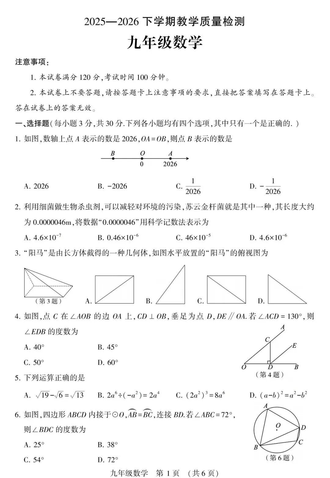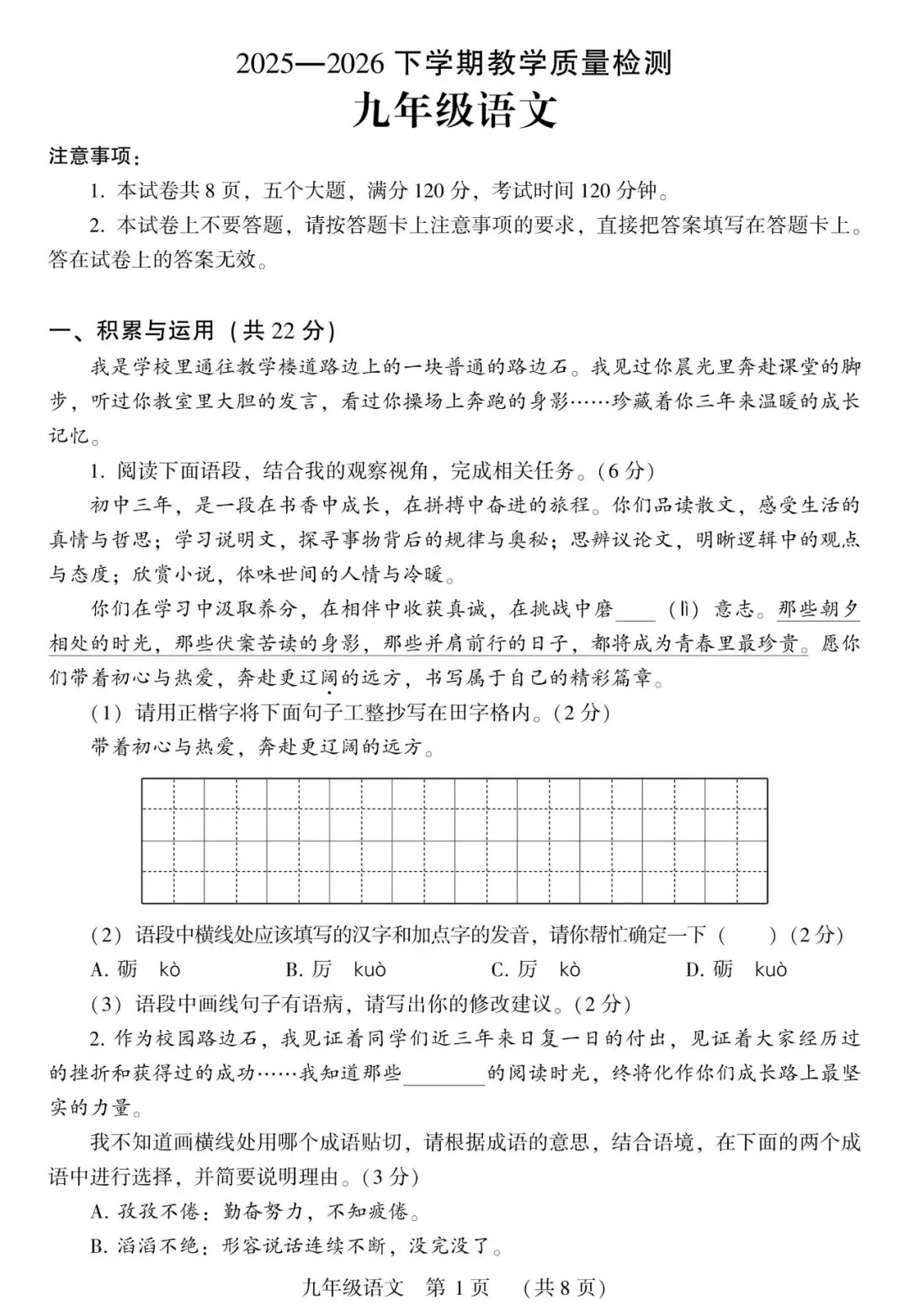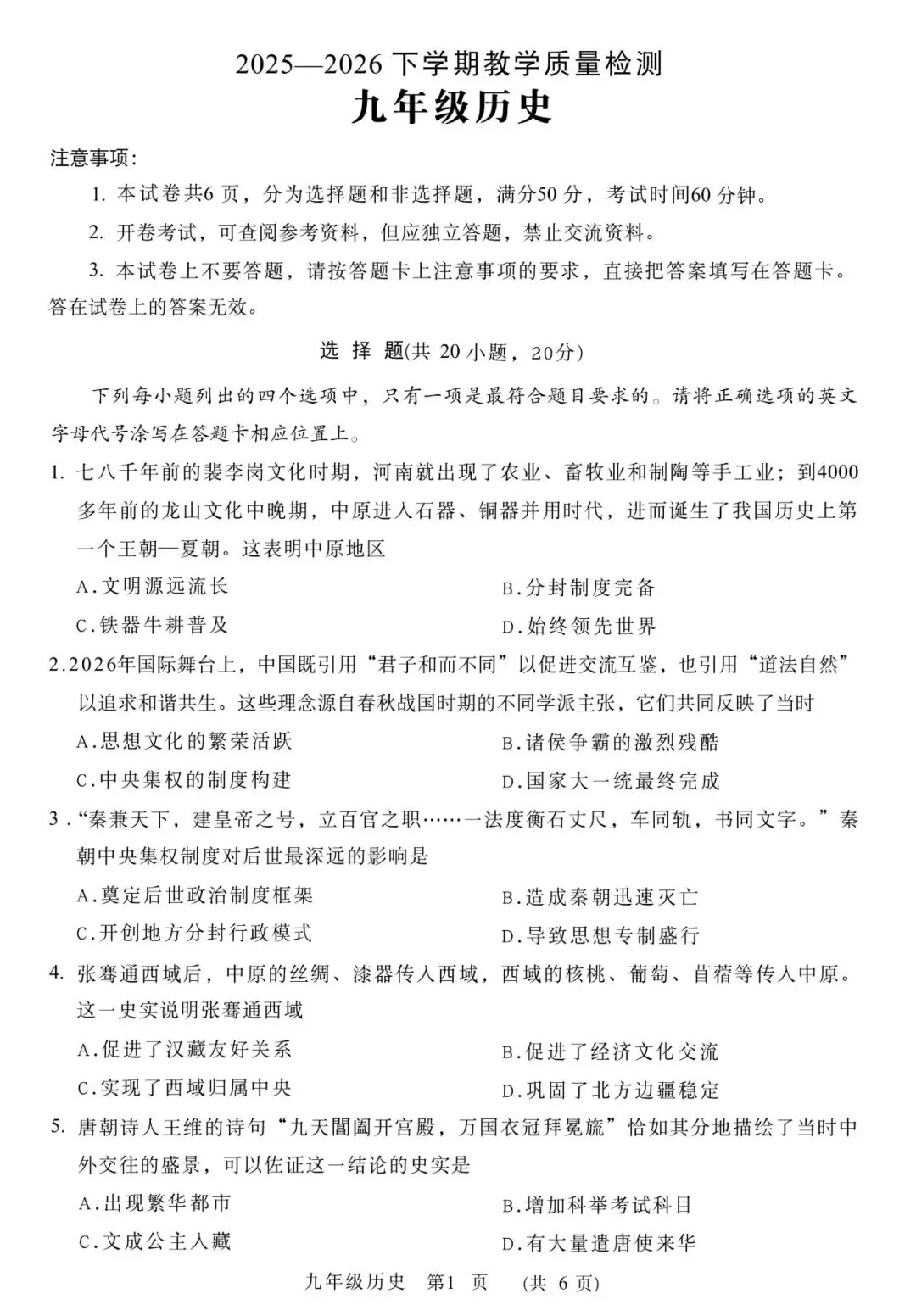 【4月中考试卷速递】许昌市联考2026年第一次教学质量检测试卷及答案(七科全)高清下载