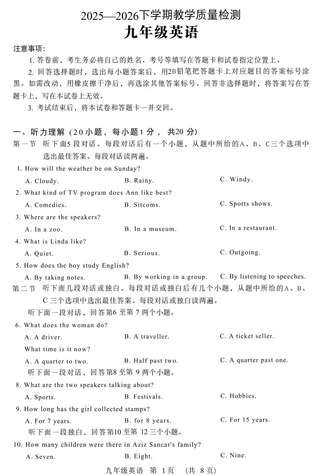 【4月中考试卷速递】2026年新乡市九年级中考一模试卷(七科全)含听力