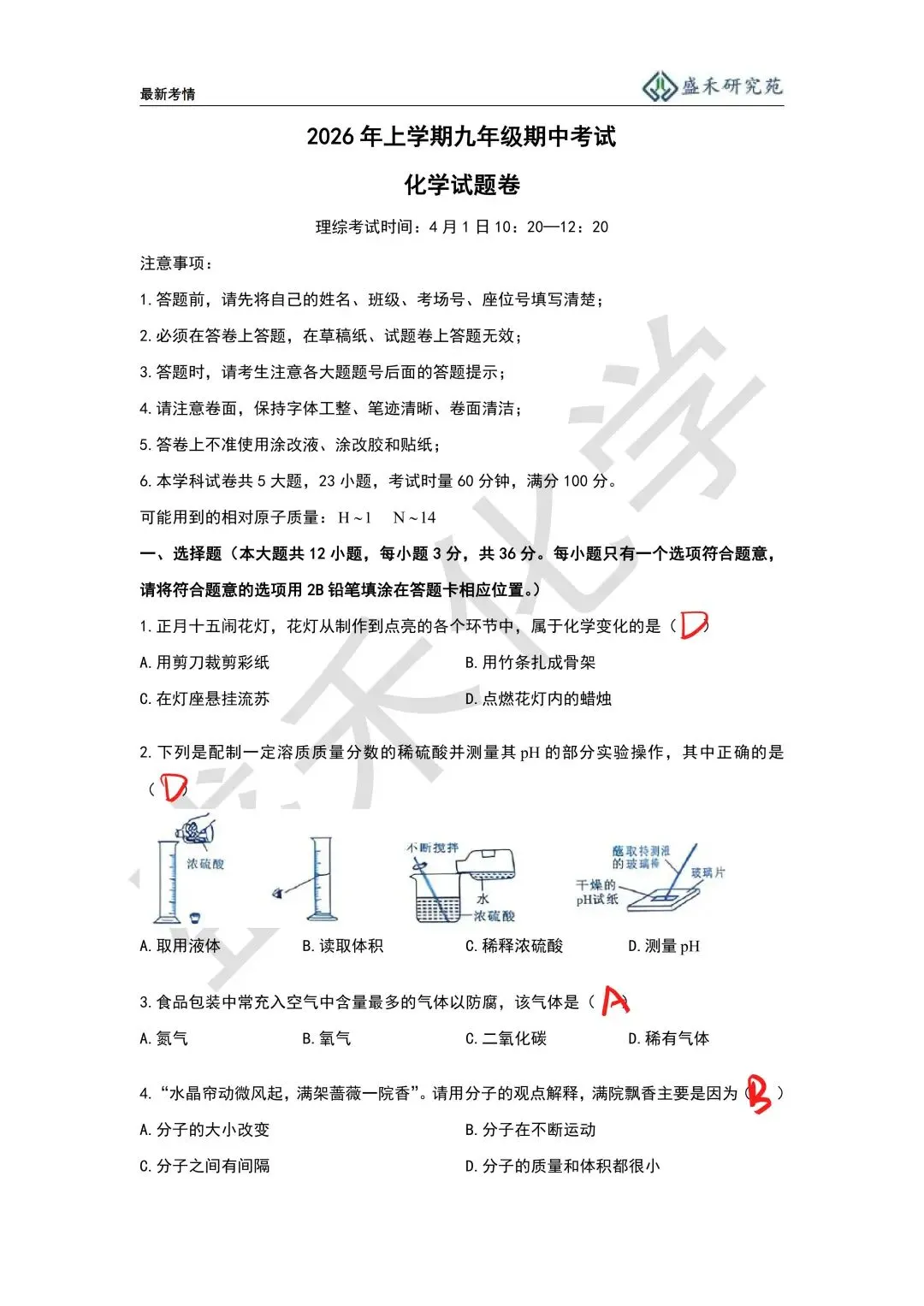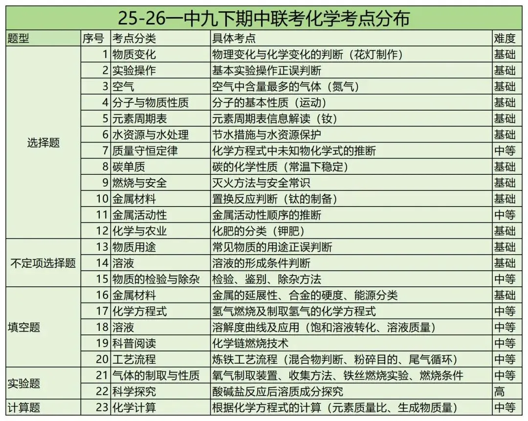 本次一中集团九下化学期中联考考试整体难度中等偏上,试卷结构合理,覆盖面广,重点考查了化学基本概念、实验操作规范、物质的性质与用途、溶解度曲线、化学与生活、工艺流程以及科学探究等核心内容。试题紧扣教材,注重基础知识的灵活运用,同时结合中国传统文化(如元宵节花灯、古代典籍)和科技前沿(如化学链燃烧技术),体现了化学学科的育人价值与时代性。整卷对学生审题能力、信息提取与处理能力、实验设计与逻辑推理能力提出了较高要求,特别是对化学用语的规范书写和化学方程式的掌握要求严格。