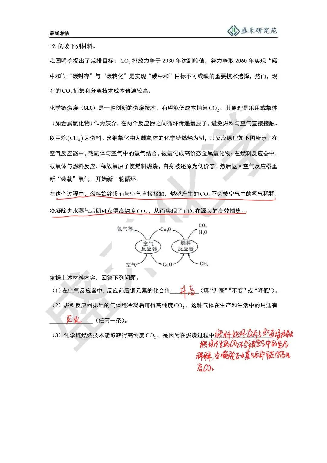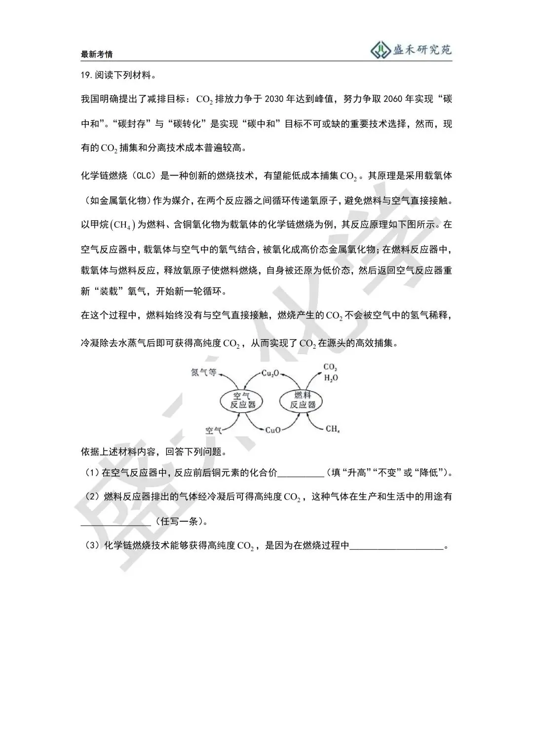 第19题 科普阅读题,考查化学链燃烧技术,涉及元素化合价变化、CO₂的用途及燃烧过程中的物质分离原理,突出信息提取能力;