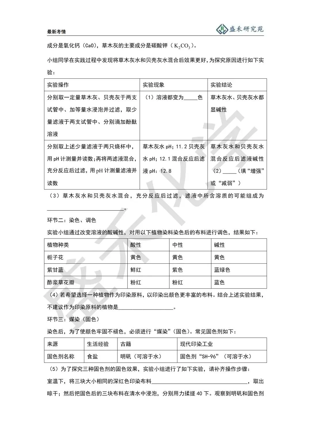 第22题 以楚式植物染为背景,围绕“碱煮—染色—媒染”流程,层层递进考查酸碱性的检验、反应后溶质组成分析、固色剂效果探究及废液处理,突出科学探究核心素养,综合性较强。