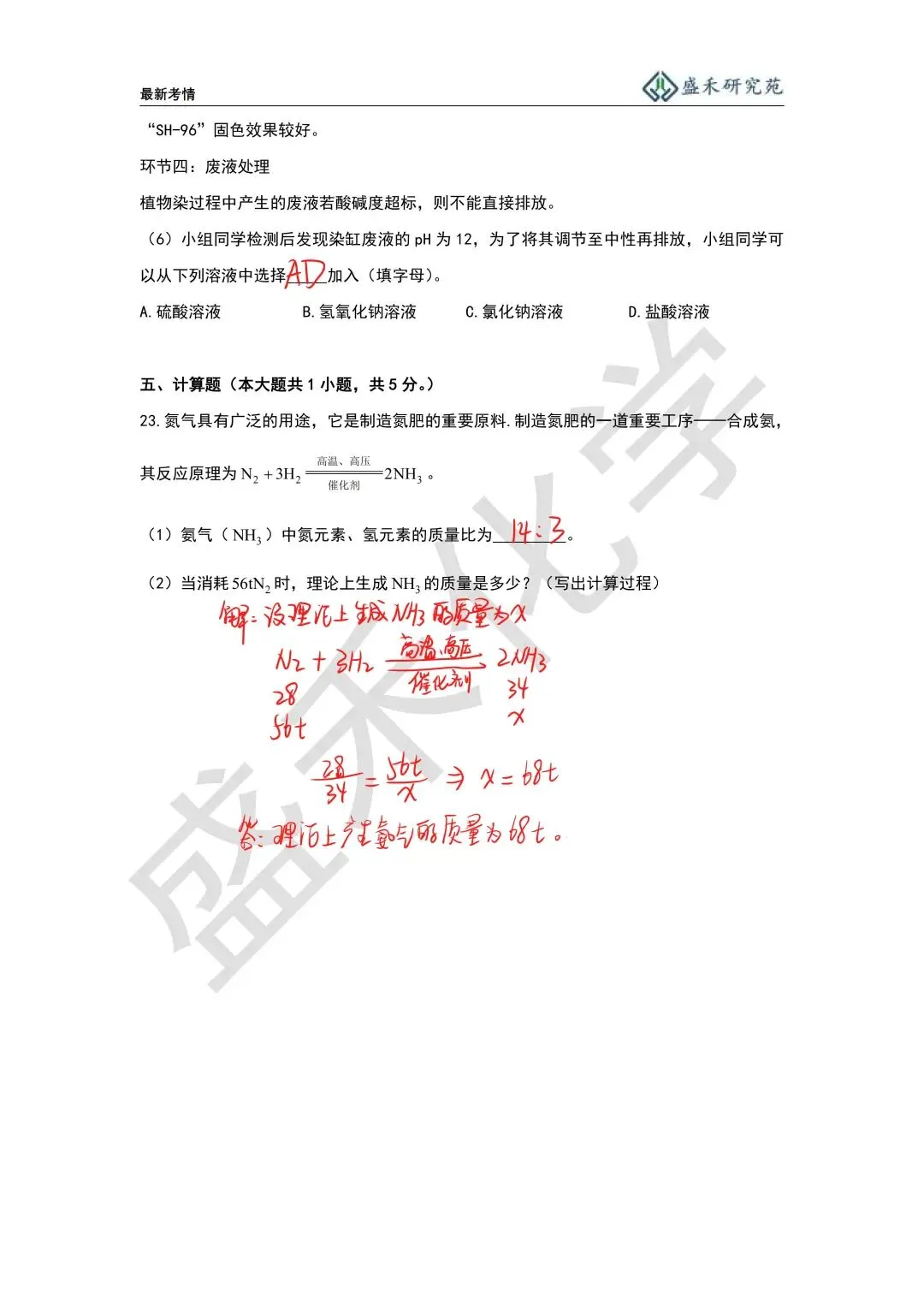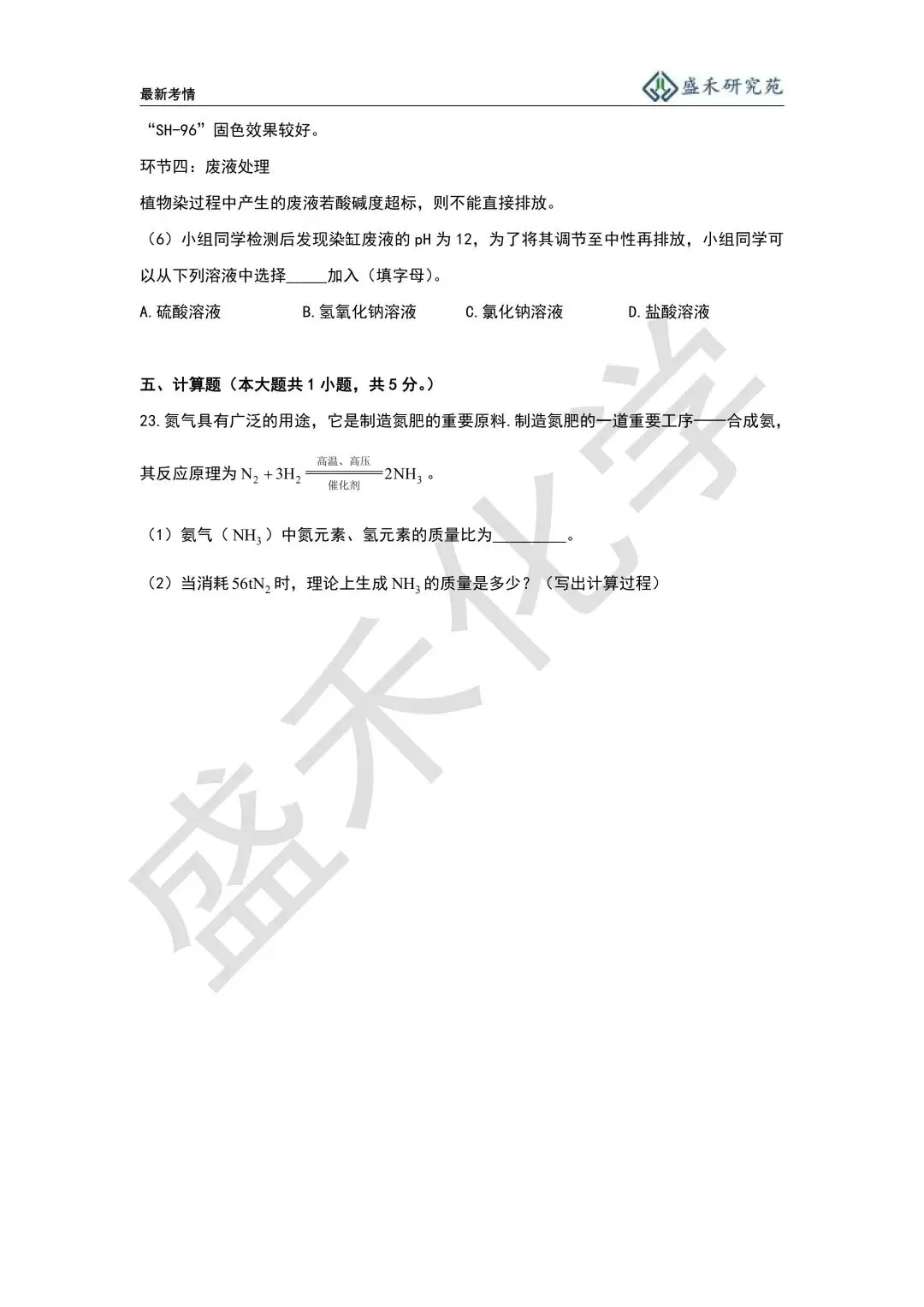 第23题 结合合成氨反应原理,考查化学式中元素质量比的计算及根据化学方程式的简单计算。题目数据清晰,过程简洁,要求学生准确书写计算步骤,规范使用相对原子质量,难度适中。
