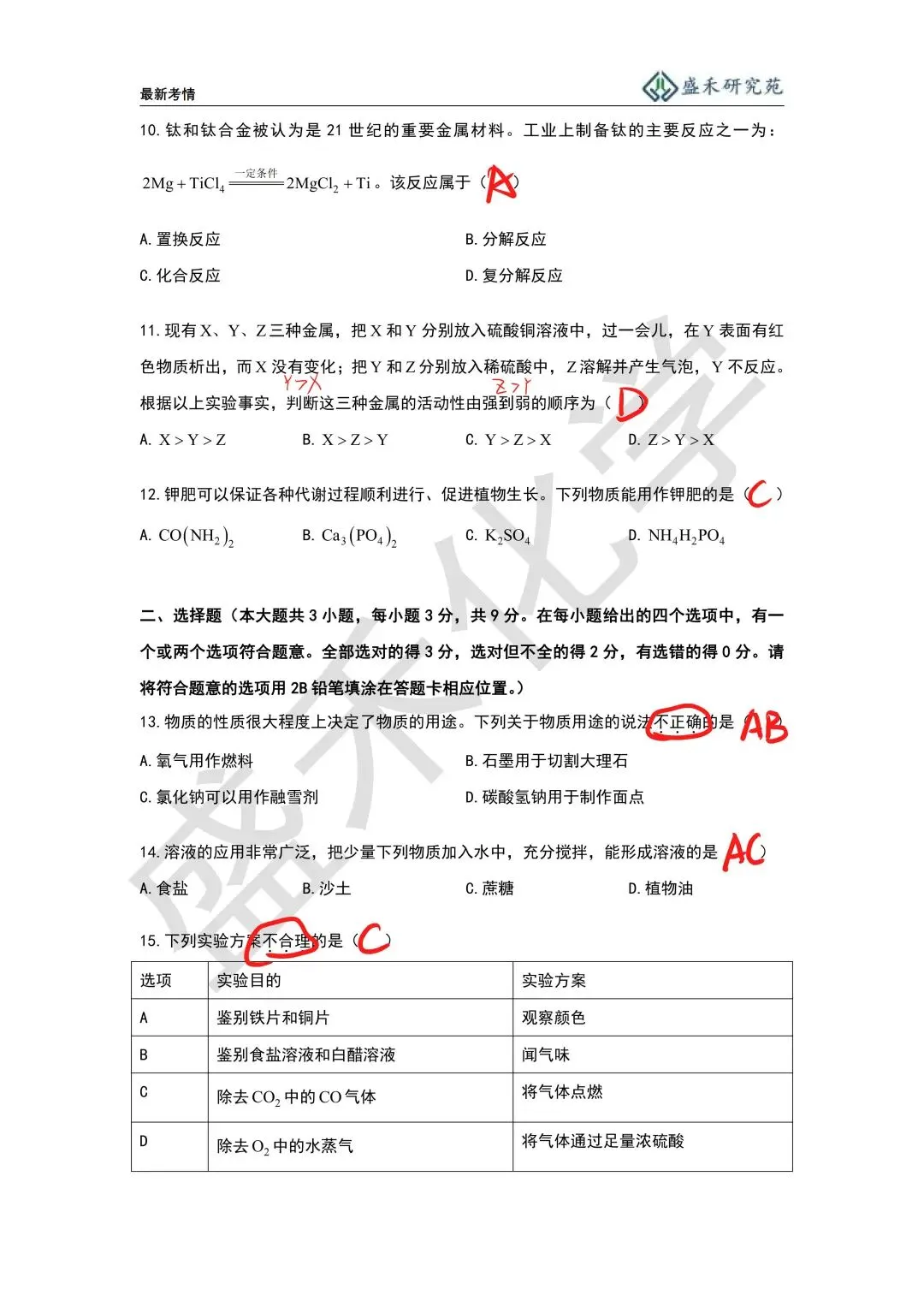 不定项选择题(13~15题) 难度有所提升,考查学生对物质性质与用途、溶液判断、实验方案设计的综合理解。