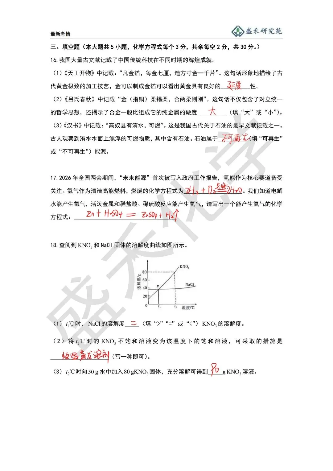本试卷立足基础,突出探究,联系实际,注重创新。试题设计既有对核心知识的考查,也有对关键能力的检验。易错点主要集中在化学用语的规范书写、实验现象的描述、图像信息的提取以及多步逻辑推理等方面。建议在后续复习中,加强实验操作规范训练,重视化学方程式的书写与配平,强化图表信息分析能力,并通过典型错题归类与变式训练,提升学生的综合应试能力与科学素养。