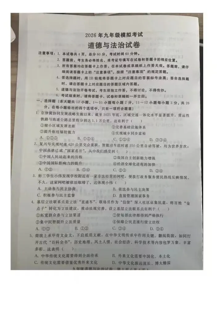 一、选择题(本大题共12小题,1~10题,每小题2分,11~12题,每小题3分,共26分。在每小题给出的四个选项中,只有一项符合题意)