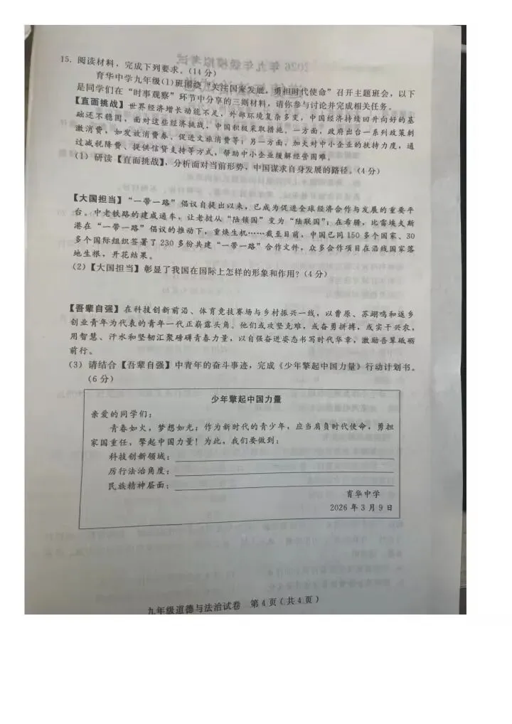 民族精神层面:在学习和生活中,发扬艰苦奋斗、自强不息的精神,勇于面对困难和挑战。(6分)(评分说明:每点2分,言之有理即可,共6分)