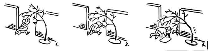 诚如漫画所示,大多数人总抱有侥幸心理,面对逐渐生长延伸的枝桠,选择一步步退让,由曲背到匍匐爬行,全然忘记“剪树枝”这个一劳永逸的方法。“人习于苟且非一日”,短视者往往满足眼前的蝇头小利,享受“当下”,透支“未来”,最终如温水煮青蛙般溺于自己的认知限制。