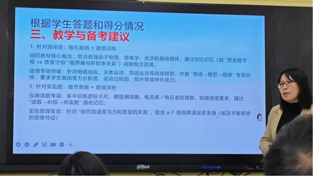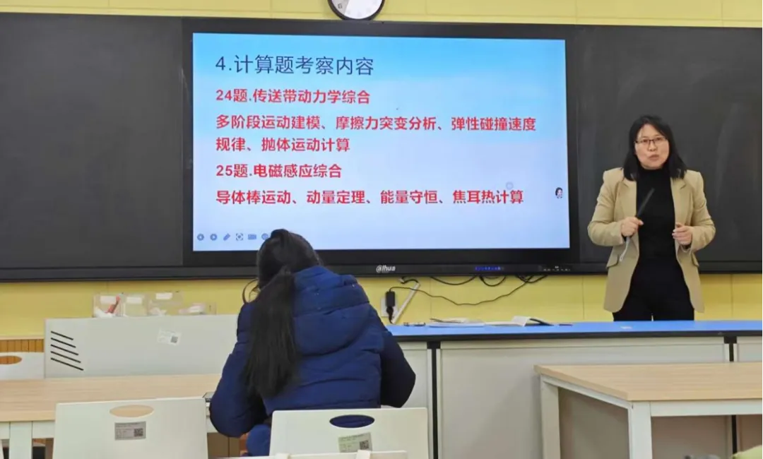 讲座中,达朝彩老师结合本次高三月考物理试卷命题特点、考查重难点及学生答题情况,展开全面且细致的分析。她首先从试卷整体结构入手,对照高考物理考试大纲及新课标要求,梳理试卷对力学、电磁学、光学、热学等核心模块的考查比重,明确试卷紧扣高考命题趋势,注重对物理基础知识、核心规律、实验探究能力及逻辑思维能力的考查。随后,达老师针对学生答题数据,逐一剖析高频错题,深挖失分根源,既指出学生在概念理解模糊、公式运用不灵活、审题不细致、解题步骤不规范等方面存在的共性问题,也分析了不同层次学生的学习短板,为后续分层教学提供了精准依据。