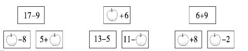 法国 意大利 德国 14块 8块 15块 法国的铜牌比意大利多几块? □○□=□( ) 3.张大爷家有15只鸡和8只鸭。(4分) 4.(5分) 小明捡了几片树叶? □○□=□( ) 5.(9分) (1)小雪比小芳多买了几瓶? □○□=□( ) (2)小丽比小雪少买了几瓶? □○□=□( ) 参考答案
