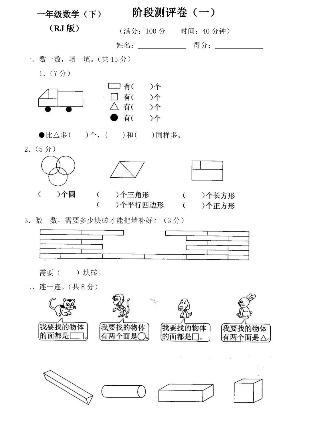 冬冬老师今天给大家整理了人教版数学一年级(下册)第一次月考试卷(含答案),请各位家长打印给孩子练练,更好的巩固所学的知识点!