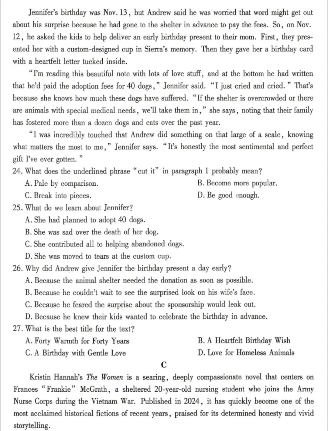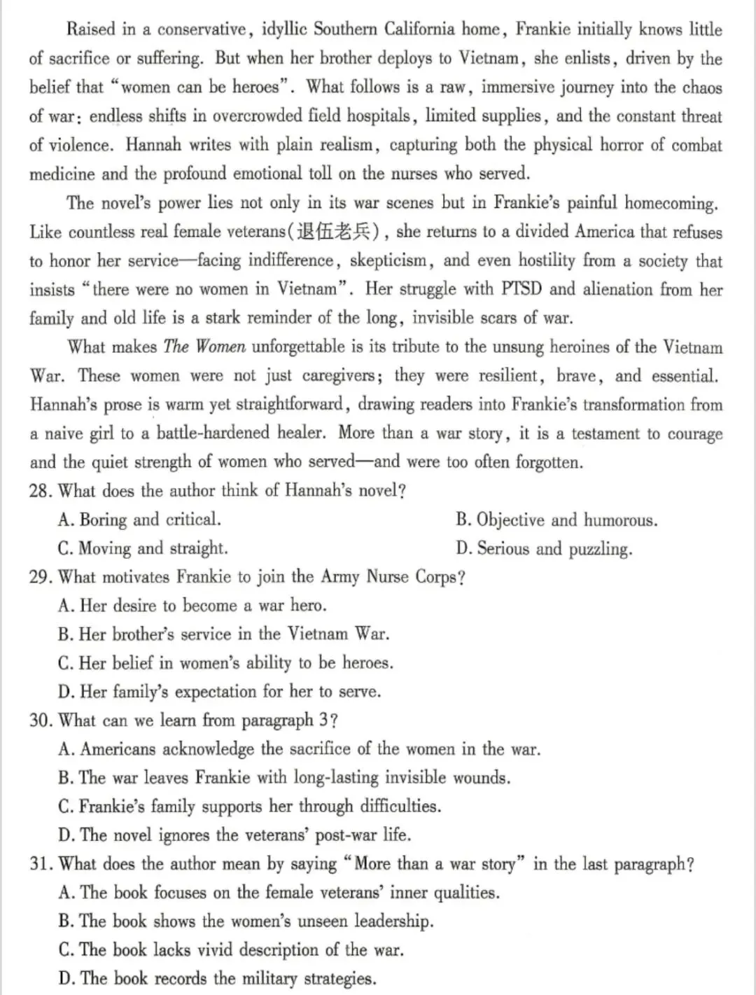 本次重庆南开中学高三七检英语试卷整体难度中等偏上,贴合高考命题趋势,侧重考查综合语言运用能力。阅读部分选材多元,涵盖小说书评、特色书店、社会温情故事、科学科普等,文本逻辑性强,细节题与推理题比例均衡,科普类文本对词汇量与长难句理解要求较高;七选五聚焦社交话题,上下文逻辑衔接紧密,需精准把握段落主旨。语言运用部分,完形填空侧重语境理解与情感逻辑,词汇辨析难度适中;语法填空考点常规,聚焦时态、非谓语、从句等核心语法,基础扎实即可得分。写作部分,应用文为校园现象投稿,贴近学生生活;读后续写情节清晰,侧重细节描写与情感表达,对语言生动性要求较高。整体试卷注重基础与能力结合,既考查知识积累,也检验思维深度,适合高三学生查漏补缺、适应高考节奏。
