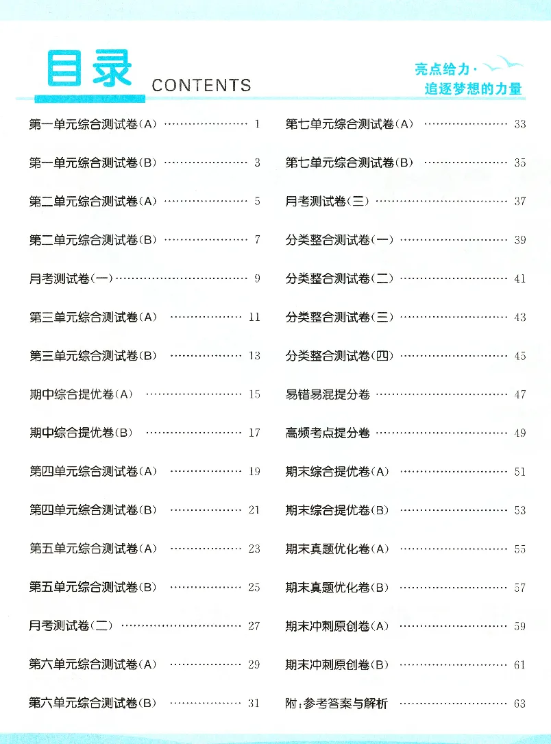再加上月考卷、期中期末卷、分类整合卷(计算专练+应用题专练+几何专练),从单元检测到专项突破再到综合模拟,层层递进,精准扫清知识盲区。