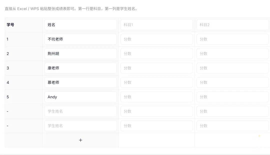 和前面批量导入学生名单一样,你可以直接从Excel表格中复制数据过来粘贴,表格会自动扩展。你甚至可以把姓名都从表格中复制过来,系统会自动和班级的学生进行匹配。