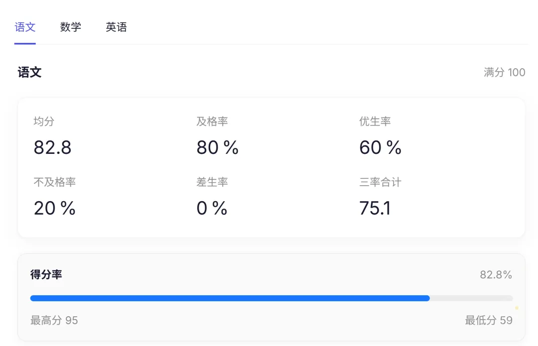 你可以在这儿查看该次考试的总览、分学科统计、分学生统计: