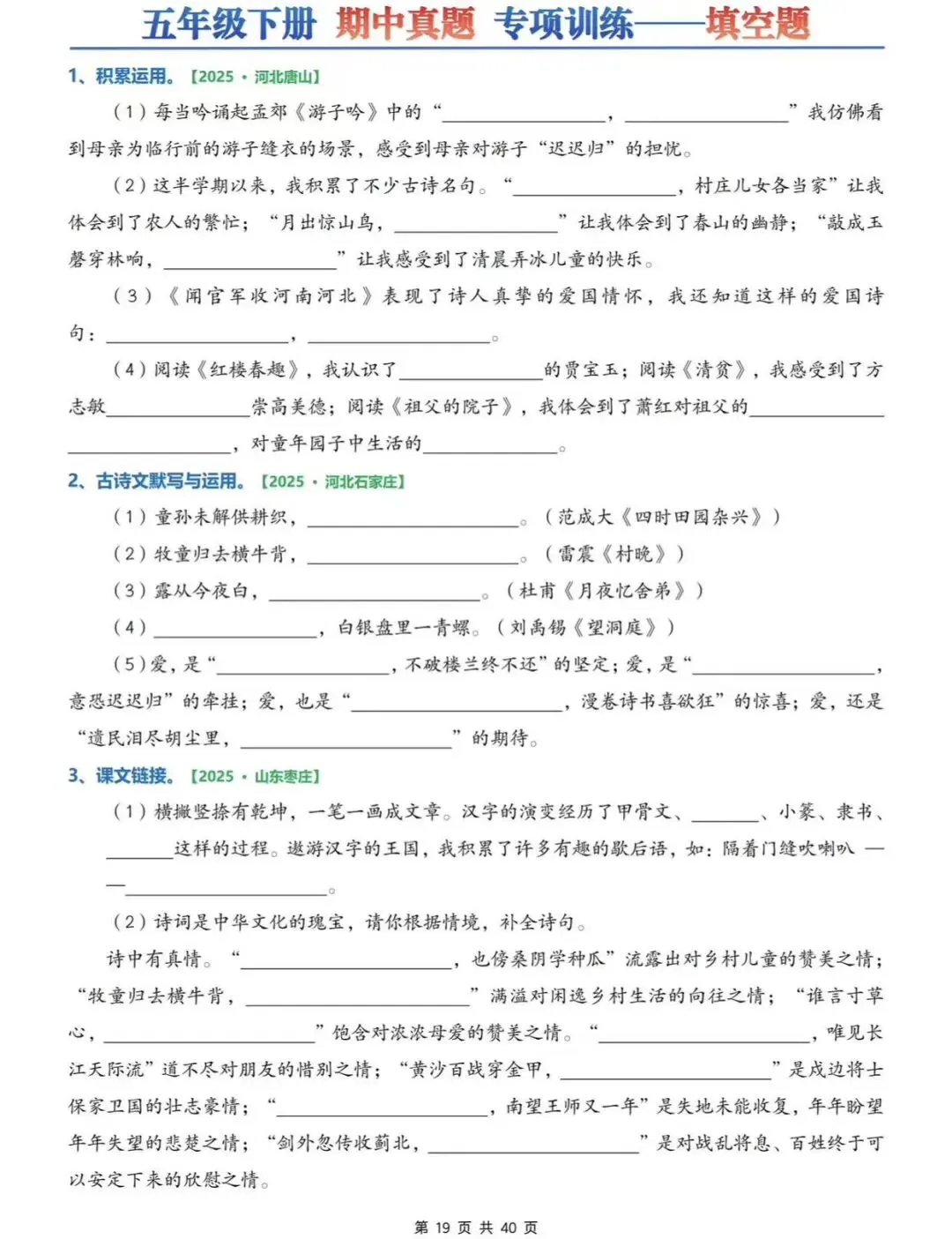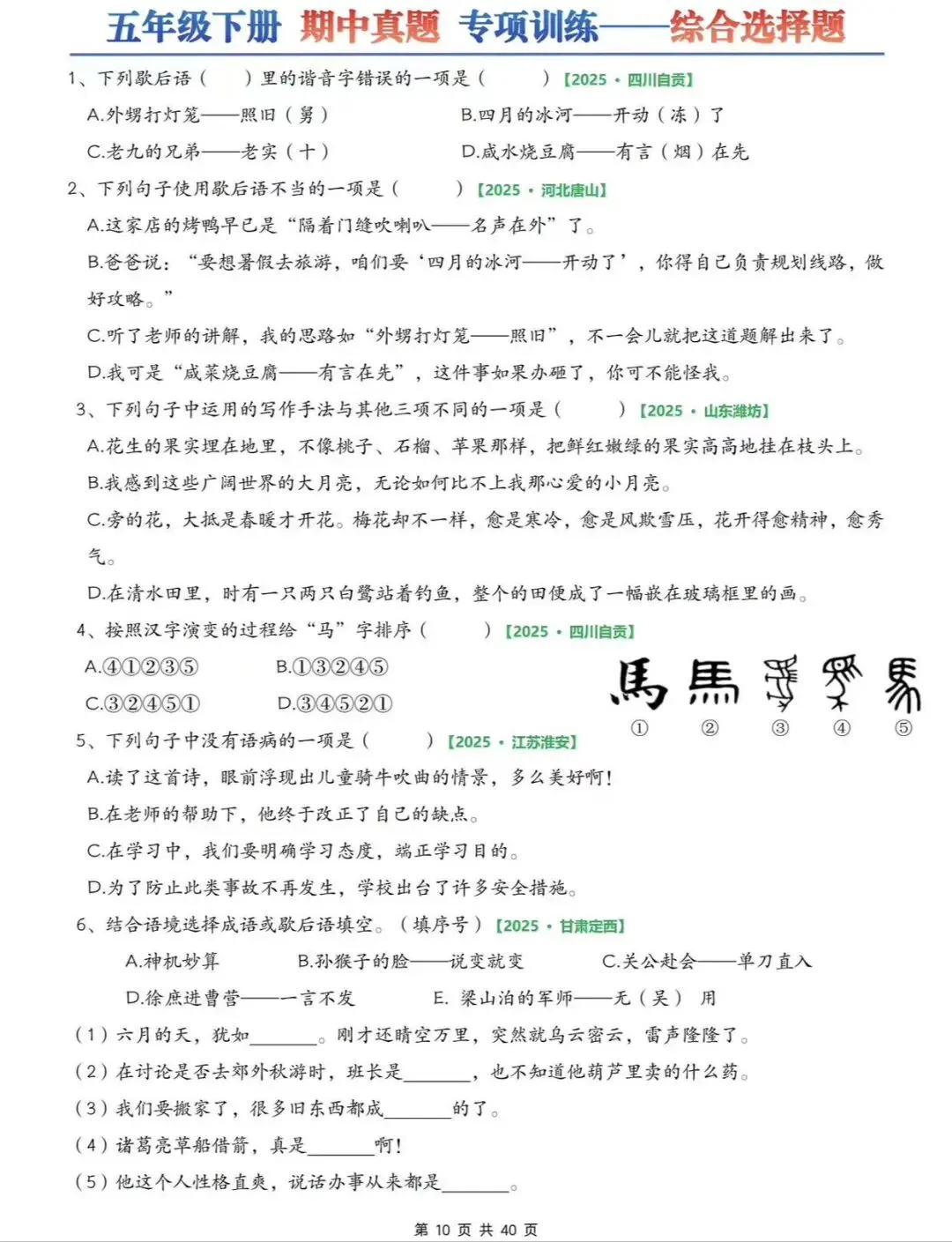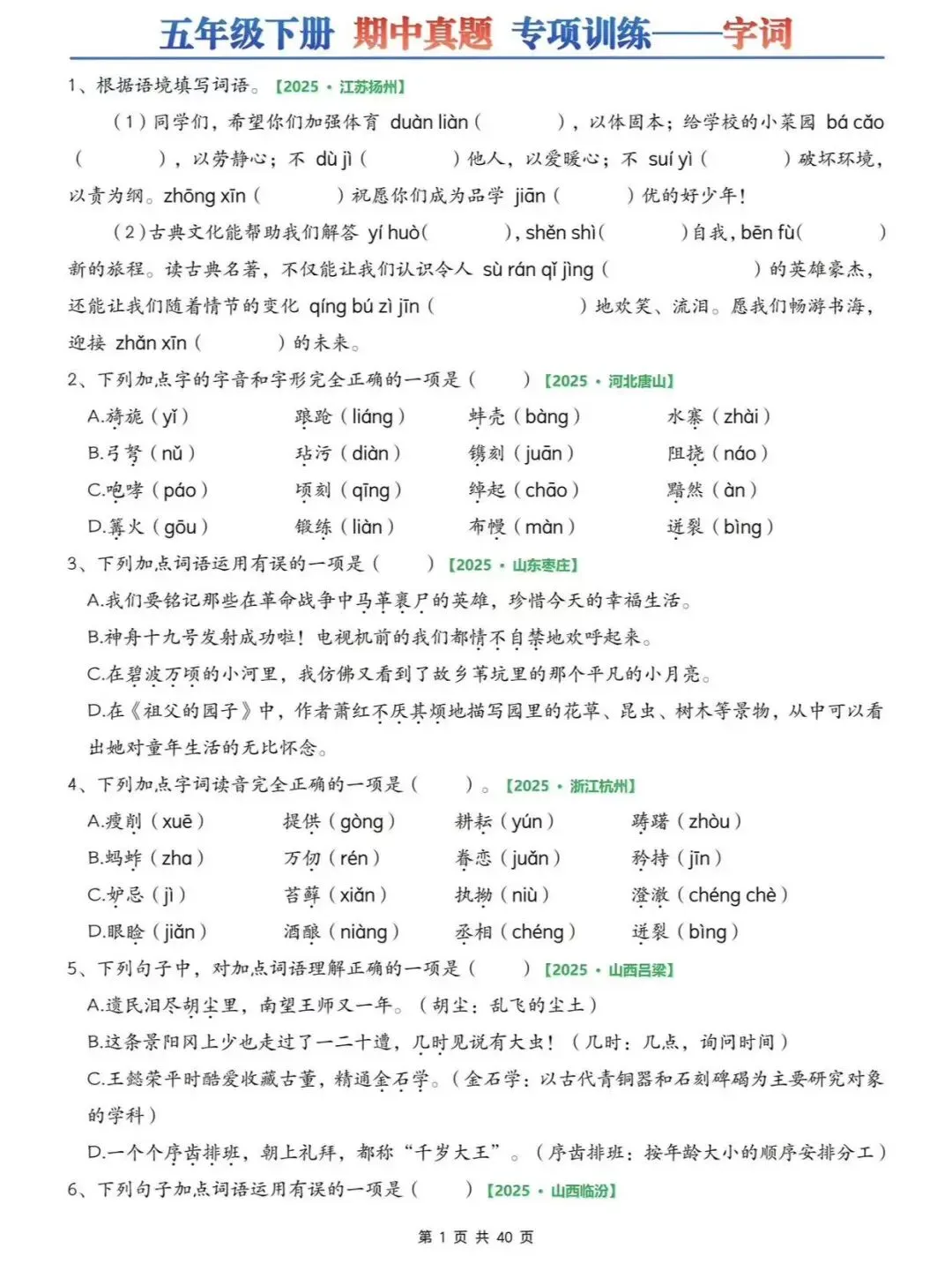 26春五下语文期中6大专项练习(往年考试真题)字词/综合选择/填空/古诗词+名言选择/句子+判断/快乐读书吧专项,可打印