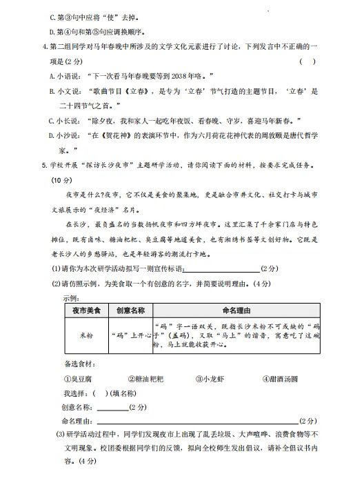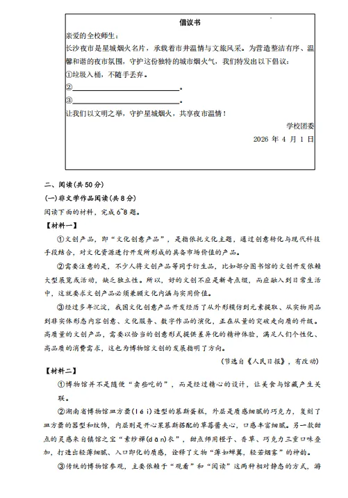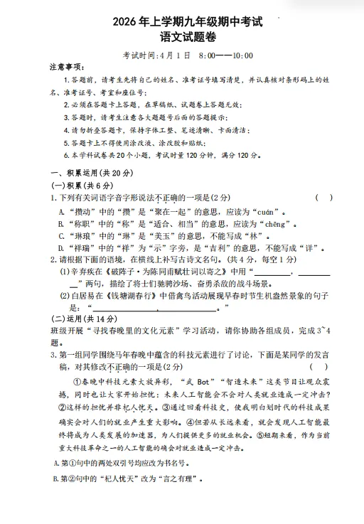 2026年中考语文:第一次模拟试卷(含答案)电子版可下载打印