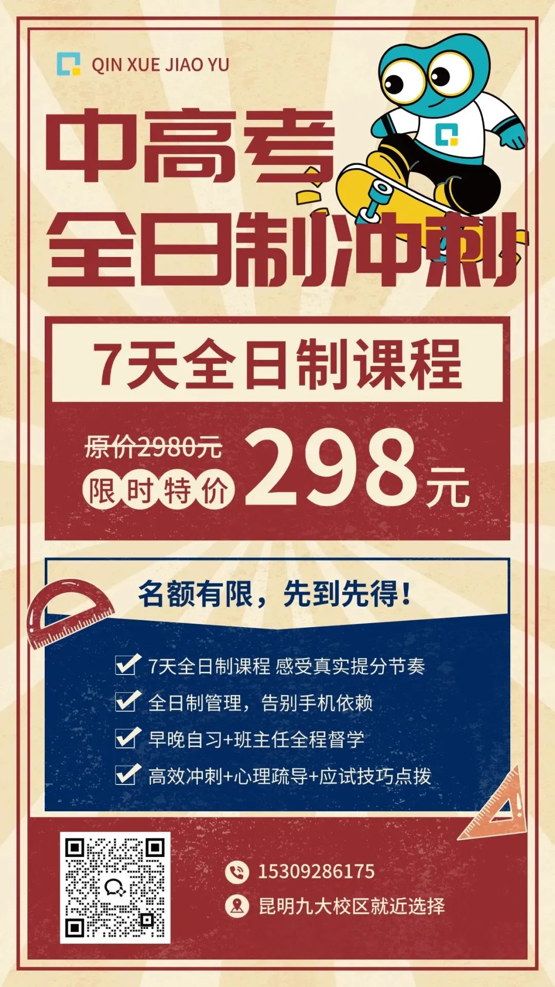 昆明秦学教育【初三/高三全日制7天体验课】重磅上线!仅需298元,让孩子沉浸式体验一周7天全日制冲刺管理,资深教师面对面、弱科精准突破、每日有规划学习计划,用7天找回冲刺状态!✅ 8人小班分层教学,拒绝“一锅炖”✅ 资深毕业班教师精讲考点、得分点✅ 全天正课+晚辅+通关考,手机统一管理✅ 每日“清底子”,当日知识当日清📅 体验包含:一周所有正课、辅导、资料、通关卷、班主任陪伴、目标规划讲座(不含食宿)🎯 适合:成绩中游、自律差、偏科严重、需换冲刺环境的高三应届/复读生