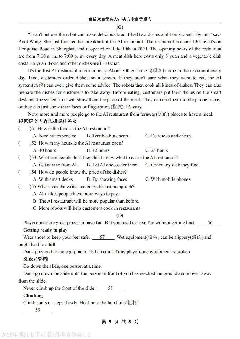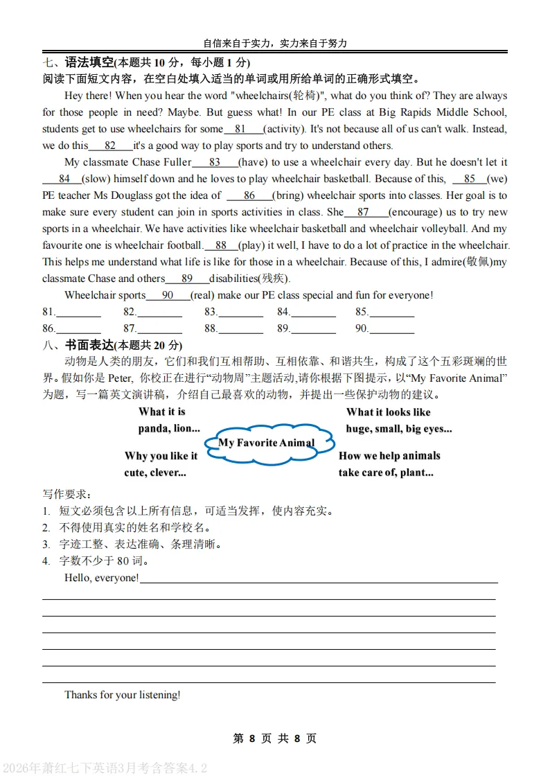 >2026萧红中学七下英语3月月考试卷及答案