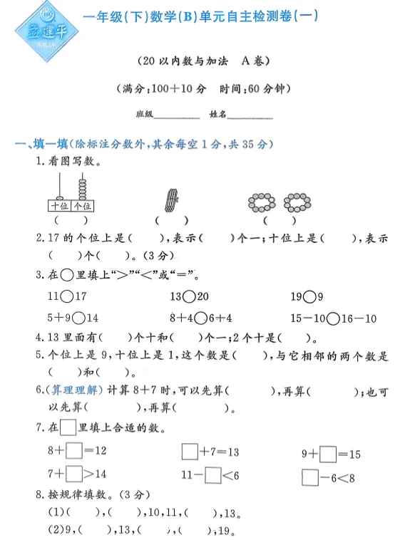 @北师大版数学一年级下册:单元检测试卷AB+期中期末卷+总复习专项检测,全册20套试卷,的下载!