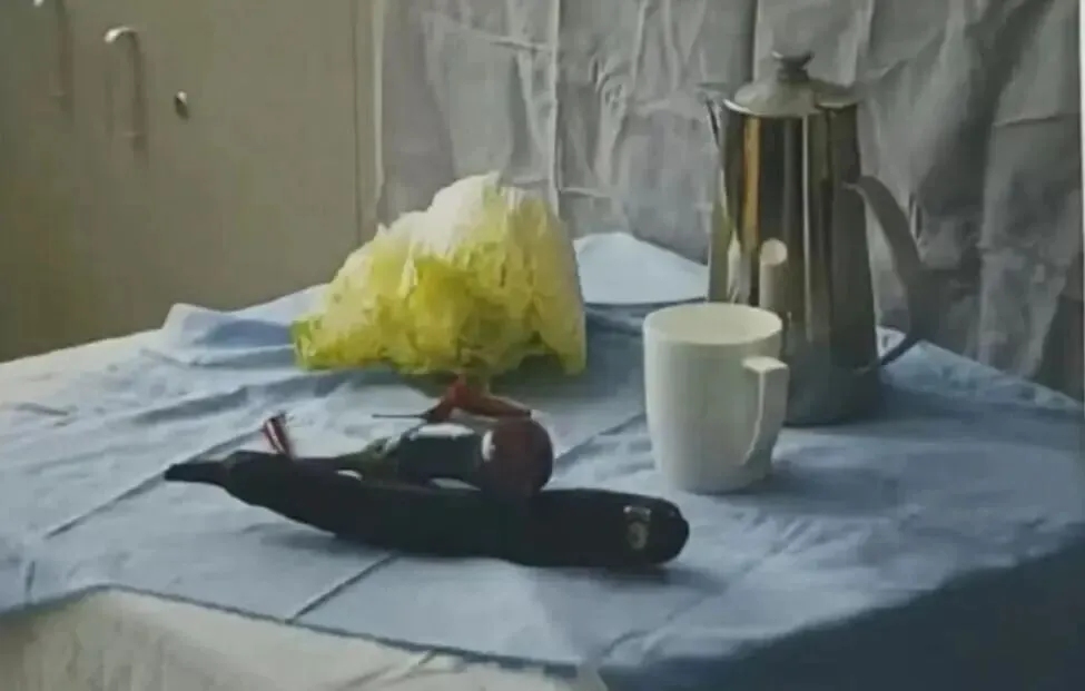 不锈钢水壶一个、白菜一颗、茄子两个、小辣椒若干、白色陶瓷水杯,蓝色衬布、灰色衬布、白色衬布