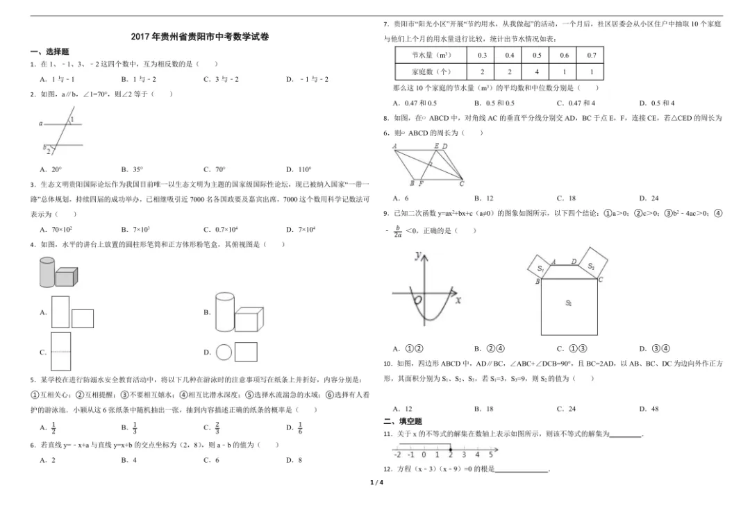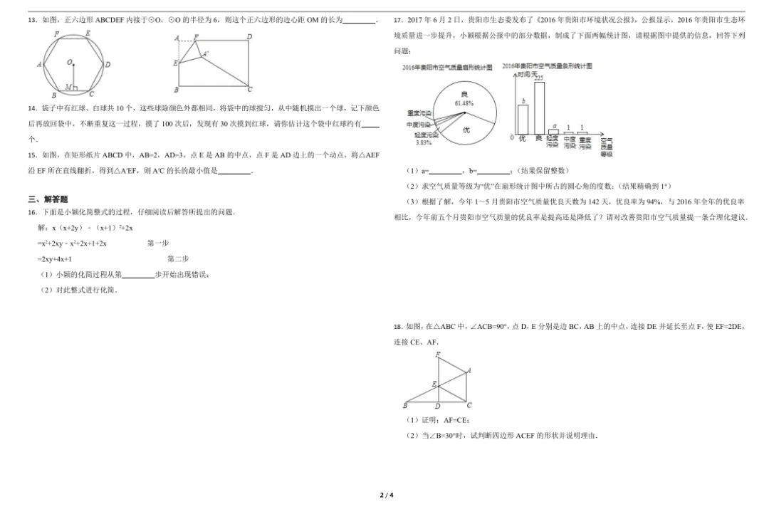 2017年贵阳市中考数学试卷是一份质量较高、导向明确的试卷,既考查了学生的数学基础知识,又检验了数学思维能力和应用意识。对于即将参加中考的学子来说,研究这份试卷,不仅能了解命题规律,更能明确复习方向。