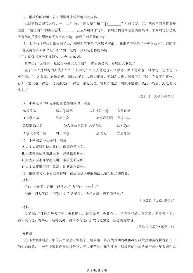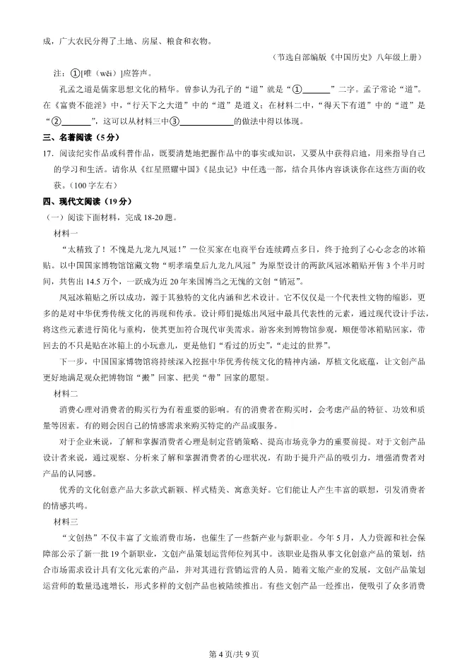 2025北京石景山初二上册期末语文试卷(有答案) 电子版试卷获取,后台回复:试卷