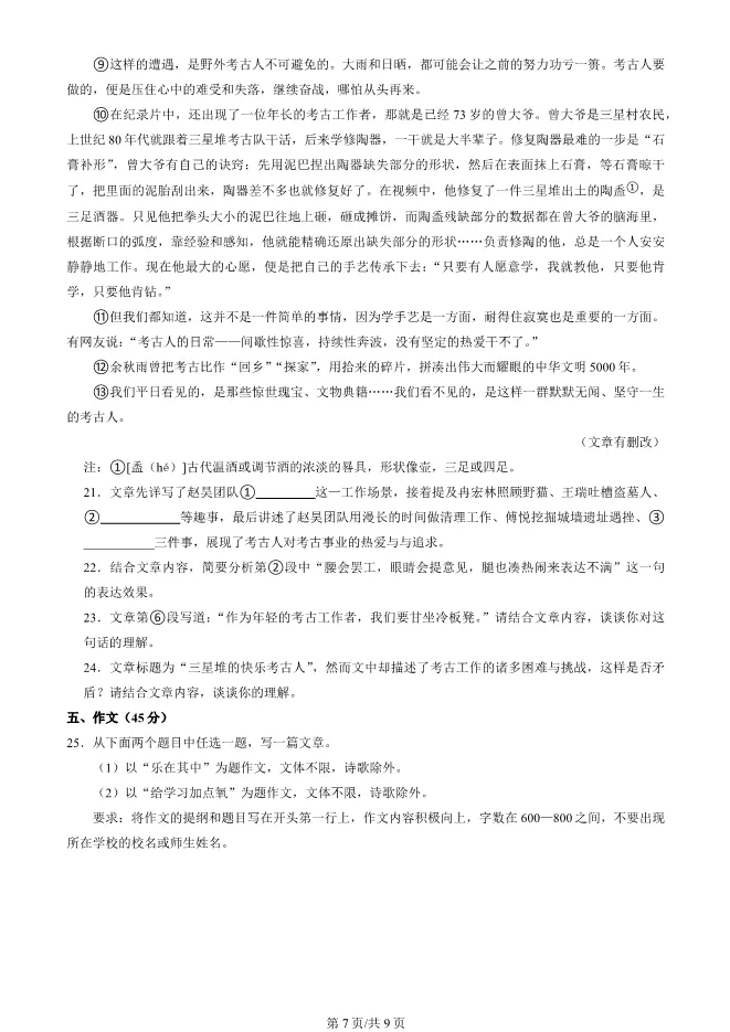 新七年级下册语文第一次月考试卷(含答案)完整电子版可打印