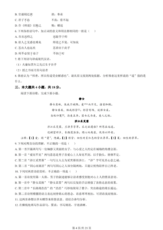 2025北京人大附中高一上册期末语文试卷(有答案) 电子版试卷获取,后台回复:试卷
