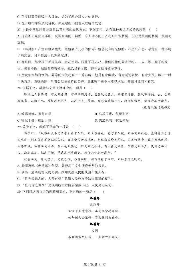 2025北京人大附中高一上册期末语文试卷(有答案) 电子版试卷获取,后台回复:试卷