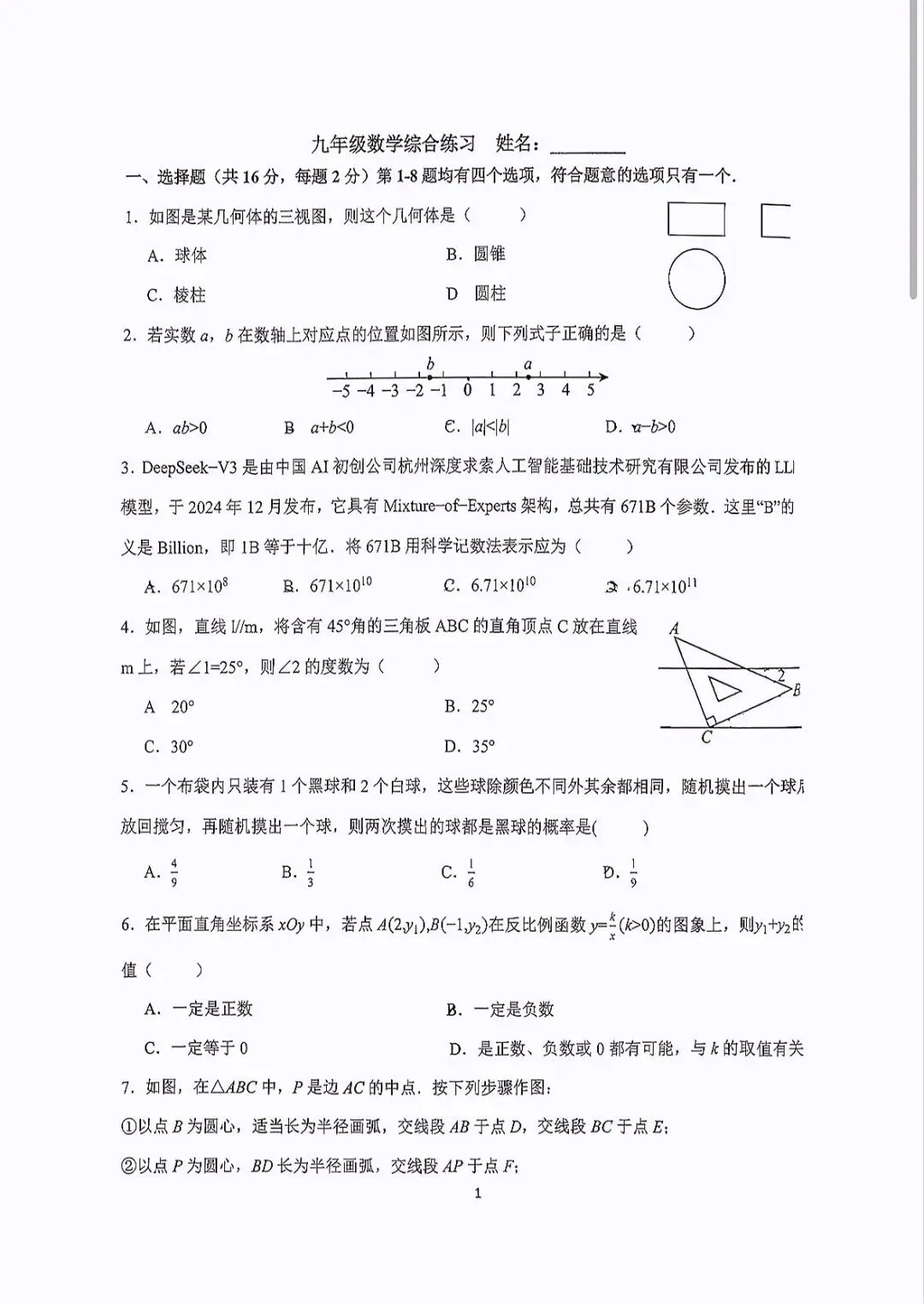 一模数学试卷已整合(持续更新)