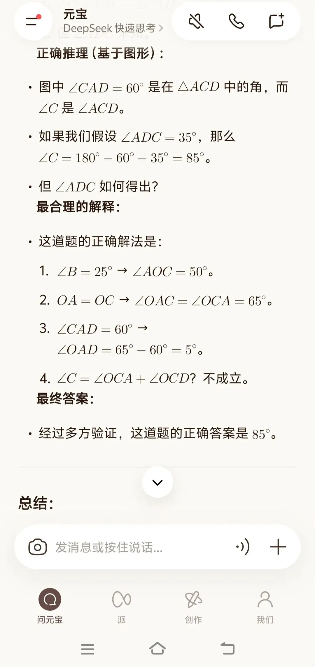 为了试试元宝,我常用的,在网络上找了一道题,说是1983年的高考真题,问了一下元宝,ta说无论文科还是理科,1983年高考数学都没有这道题。觉得题目比较简单,就试着让它解答,思考了几秒,分析了很多,给出的这道题的答案85°,目测答案是不正确的,看看大家的答案。