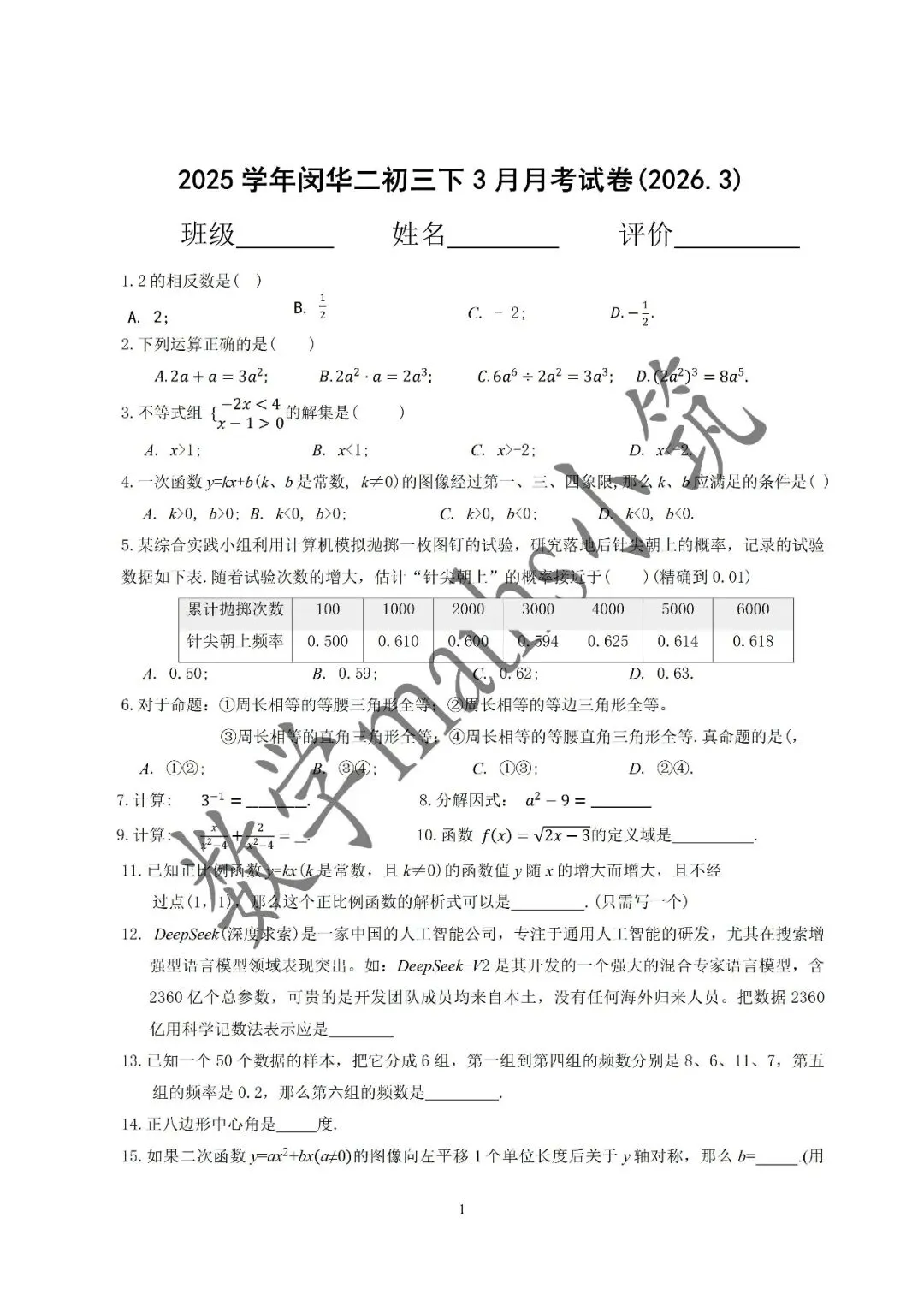 >名校试卷:2025-2026学年上海华二附属初级中学(闵行分校)初三下3月月考试卷