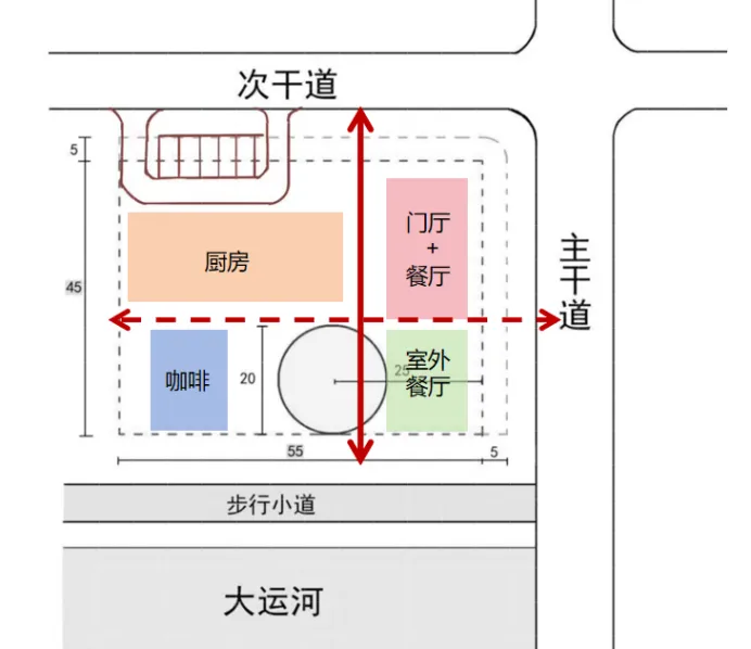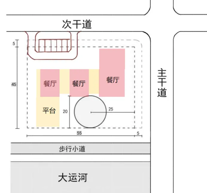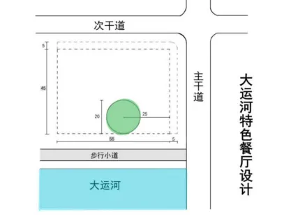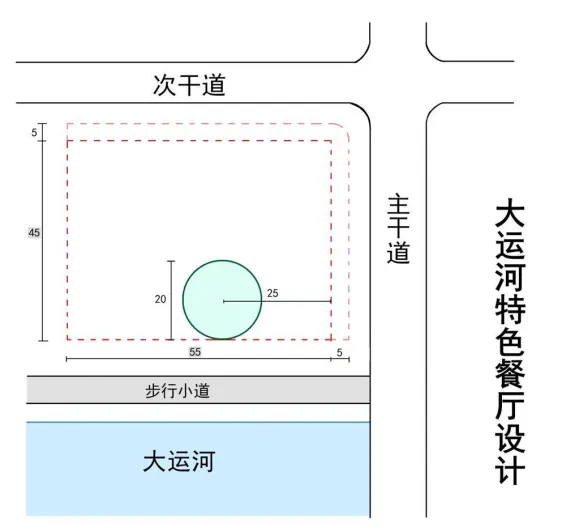 拟在江南某城市的运河边建设一座大运河特色餐厅,兼具厨房备餐和餐饮观景的功能。地块内有一颗古树需要保留,场地南侧为大运河,有一条步行小道,东侧和北侧为城市道路。地块面积为2500㎡,北侧和东侧建筑红线需退让用地红线5m。