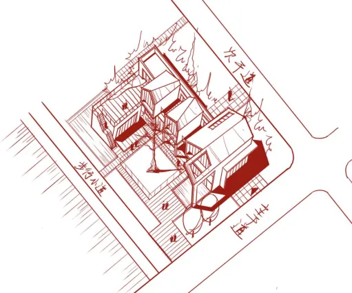该方案将两条贯穿流线汇聚于中心的古树广场之中