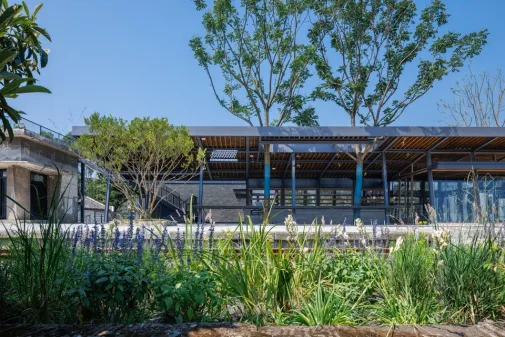 餐厅前场原有两棵梧桐树,棚棚儿原本为它们预留出破顶的空间。但开挖过程中发现两棵树的根系已空,又在施工中长期暴露,健康状况出现不可逆的衰退。两棵梧桐树被移植至公园内更适宜的环境,并在原址补种了两棵成熟的栾树。两棵树枝桠突破棚儿顶,树梢远眺远处的龙门山,他们成为建筑的一部分,持续生长。