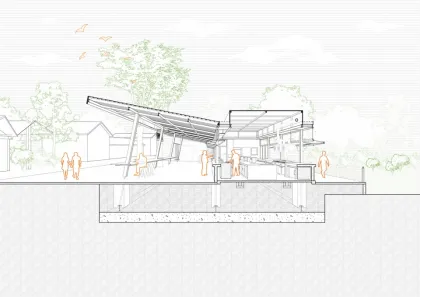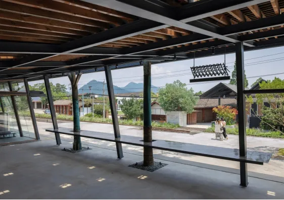 川西坝子的劳动人民历来有着“搭棚棚儿”的习俗,设计紧扣这一地域特色与“老站新生”的主题,特意让出四分之一的红线范围,在原有关口老站一侧延展出一个与之齐高的倾斜半室外棚顶,既作候车区,亦为餐厅核心。一座轻质钢楼梯在不扰动老建筑的前提下,将棚顶与老站屋顶平台相连,使历史空间转化为餐厅的有机延伸。