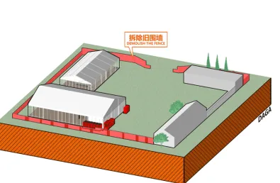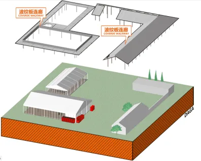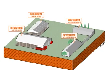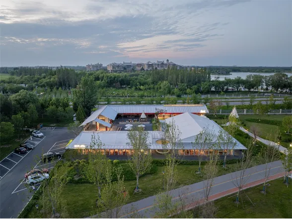 项目位于中国绿发文安生态旅游度假区,是一个由两座篷房和四间瓦房构成的小院餐厅,四间瓦房是原始的民宅,现作为餐厅的包间使用。而两座篷房则是刚建成不久的作为团餐使用的大空间建筑。