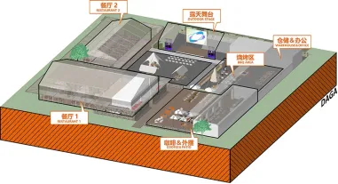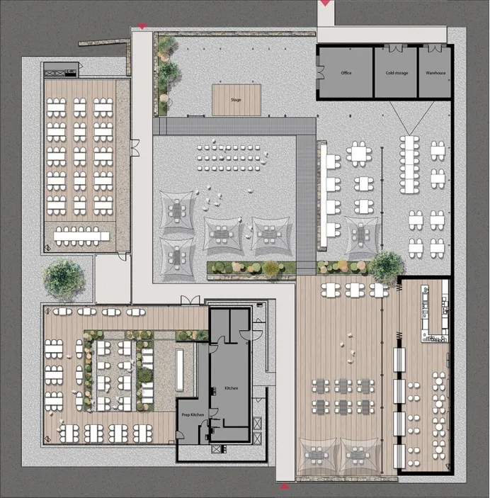 为了适应度假区的整体松弛氛围,设计营造了多样化的休闲商业场景,除花房餐厅功能外,还引入咖啡、烧烤等不同业态,并在场地中央设置露天空间,用于表演、游戏与社交活动,进一步增强互动性与参与感。丰富的功能叠加使场地不再只是餐饮或配套商业,而是一个集聚人气、承载多元体验的“开放舞台”。