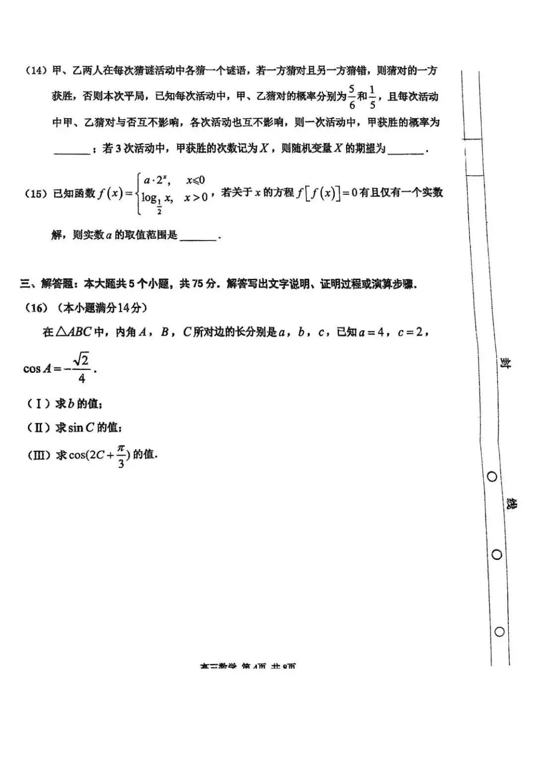 - 题量:选择题9道(45分),填空题(文档未显示具体数量,通常为6道),解答题5道(共75分)。