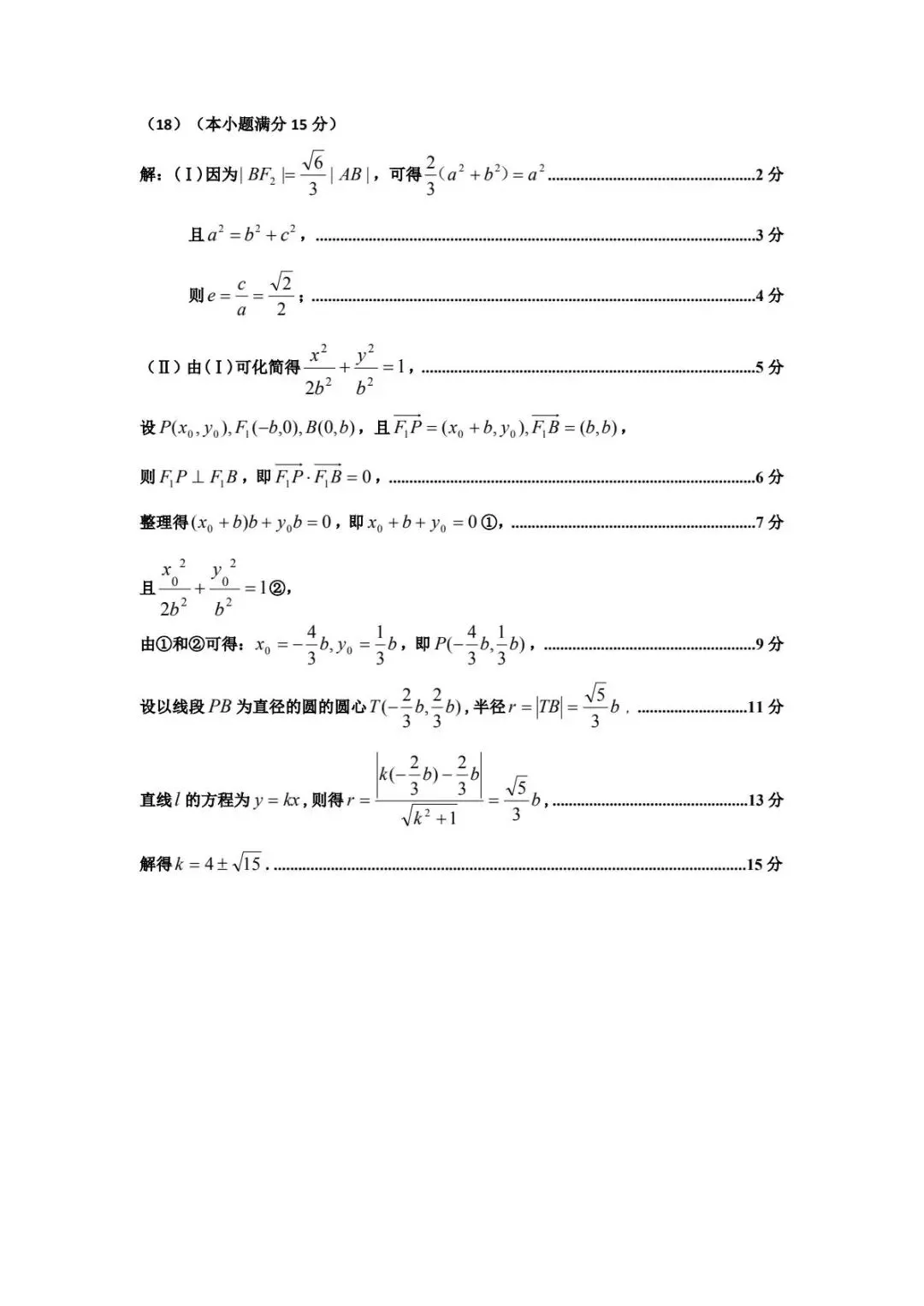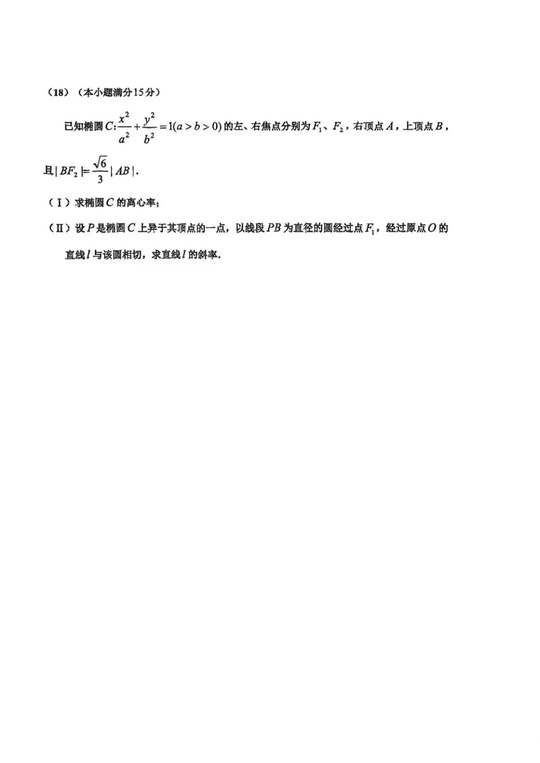 - 第(18)题椭圆问题,第(Ⅰ)问求离心率,第(Ⅱ)问涉及圆的性质与直线与圆相切,计算量较大,对逻辑推导要求较高。