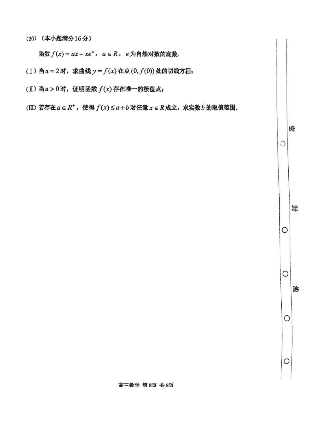 - 第(20)题(Ⅲ):将导数中的极值问题与不等式恒成立问题(f(x)<=a+b )结合。不仅要求证明极值点的唯一性,还要在此基础上求参数 b的范围,体现了函数、导数、不等式三者的深度交汇。