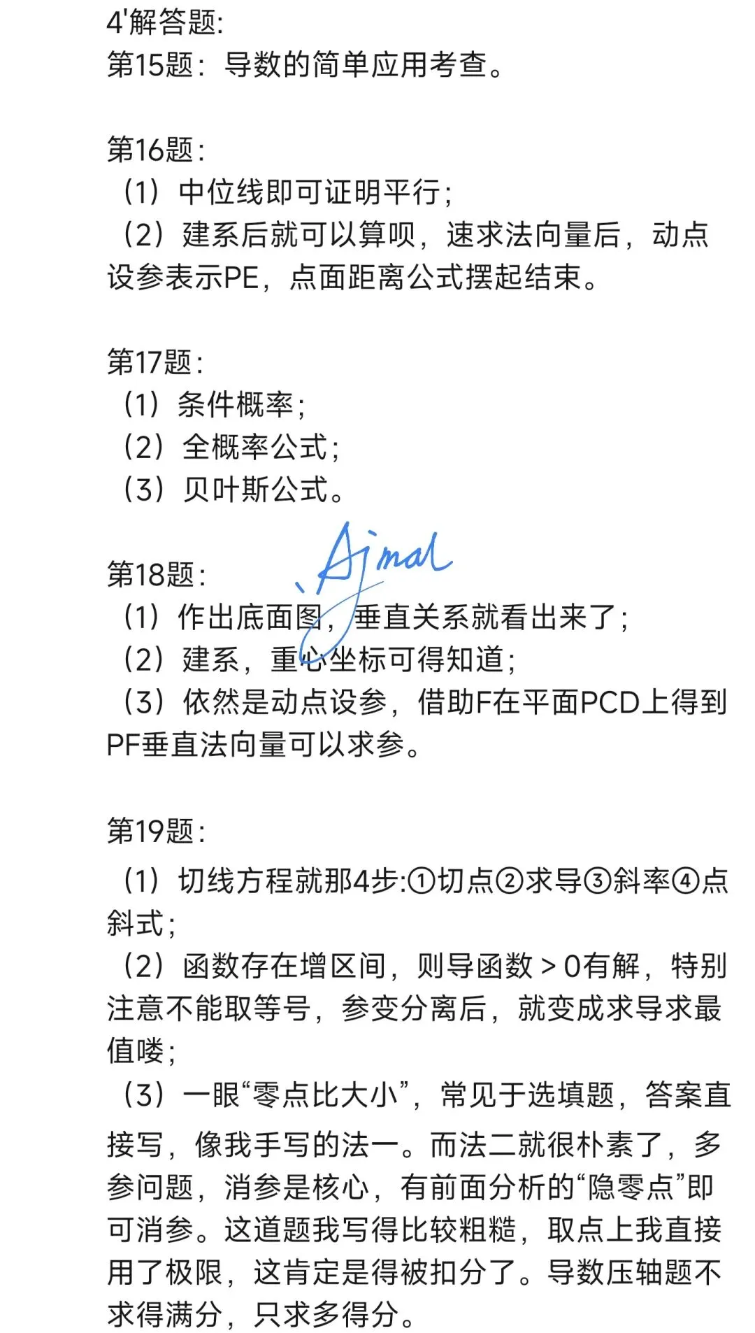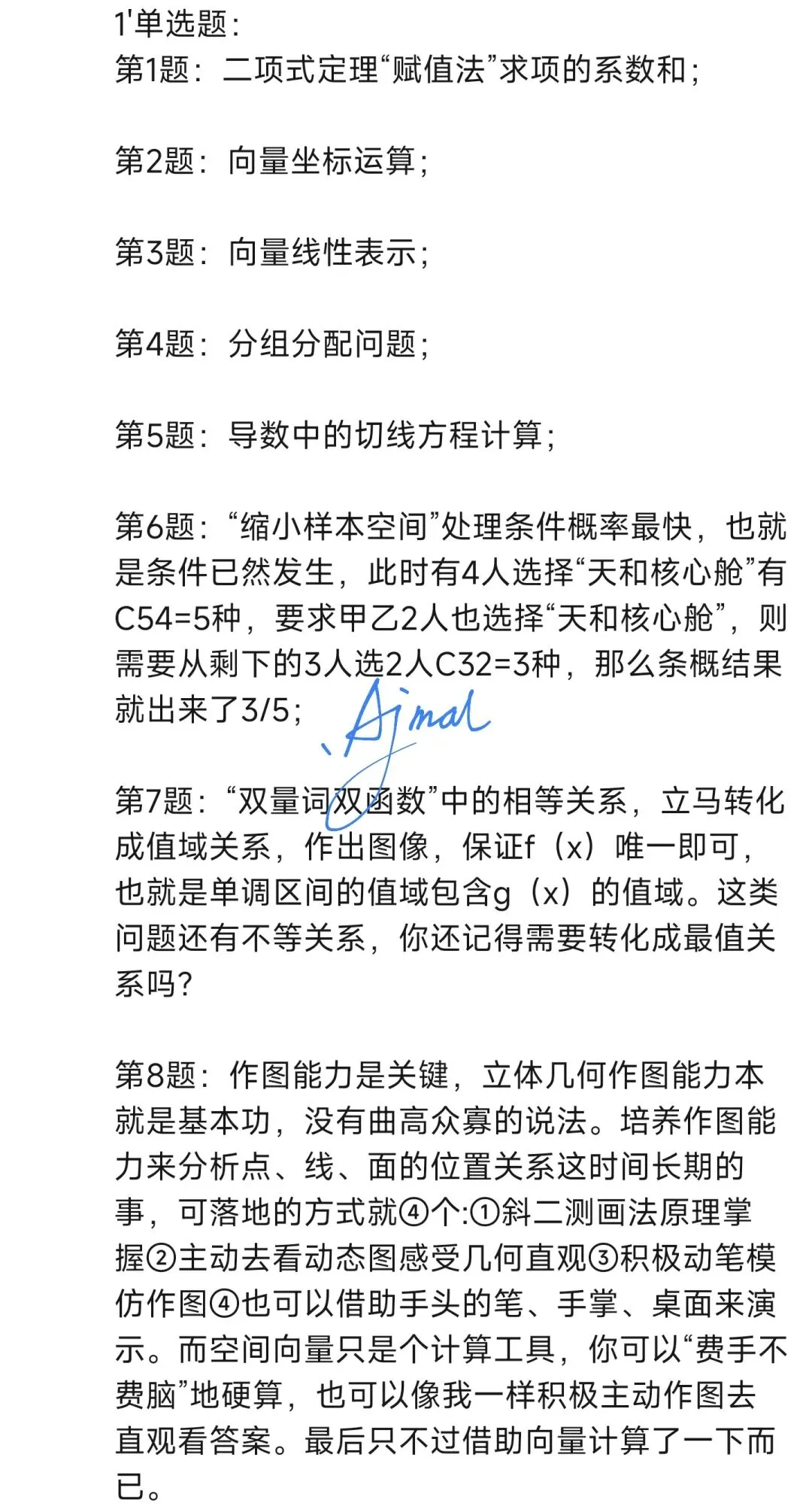 反观立体几何,就有点强度了,解答题两题都是动点计算量,选题压轴第8 11,第11“等边等角的平行六面体结论熟悉”还行,要是去建系就麻烦了。