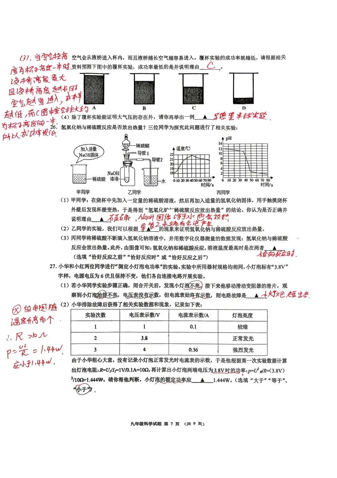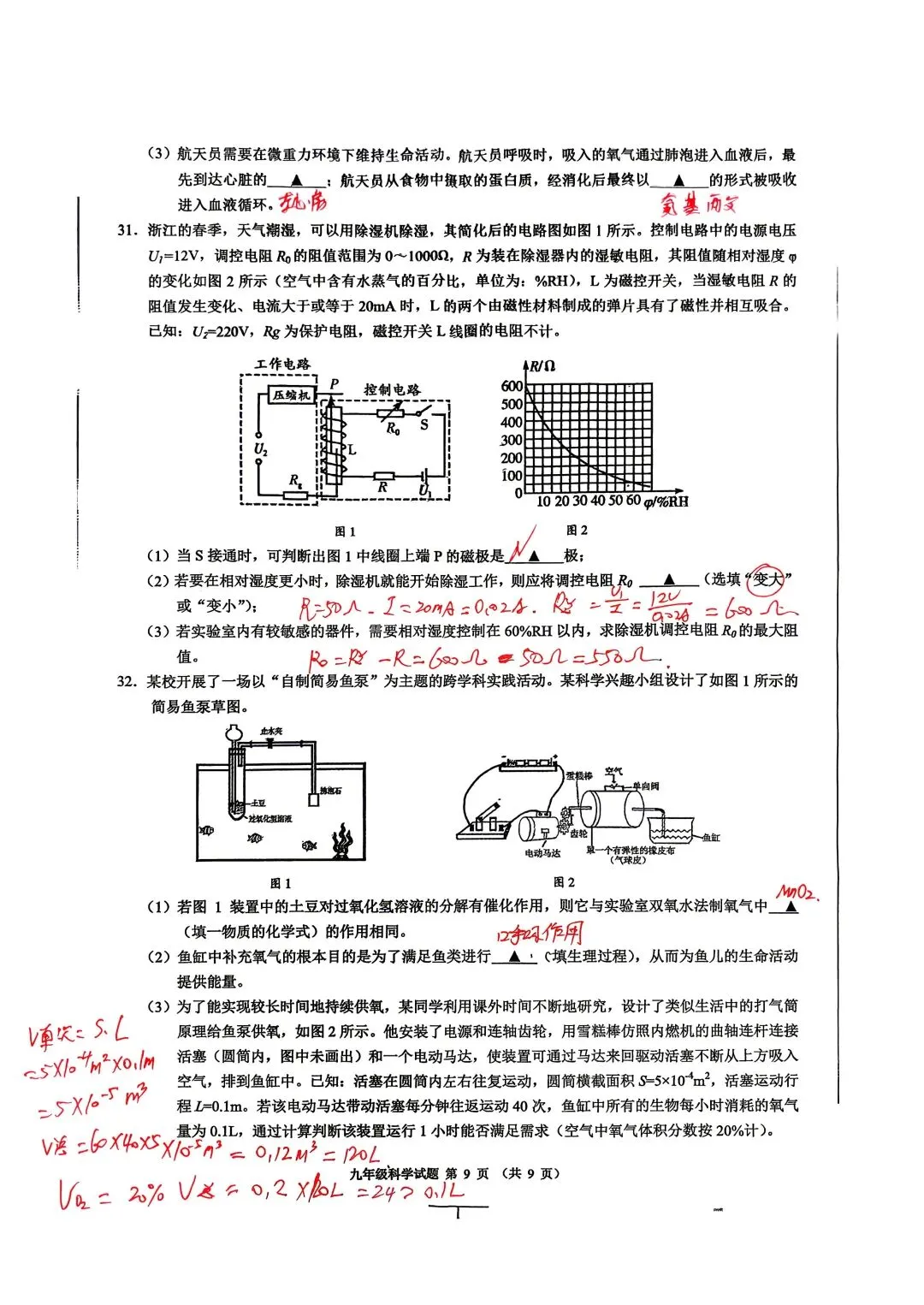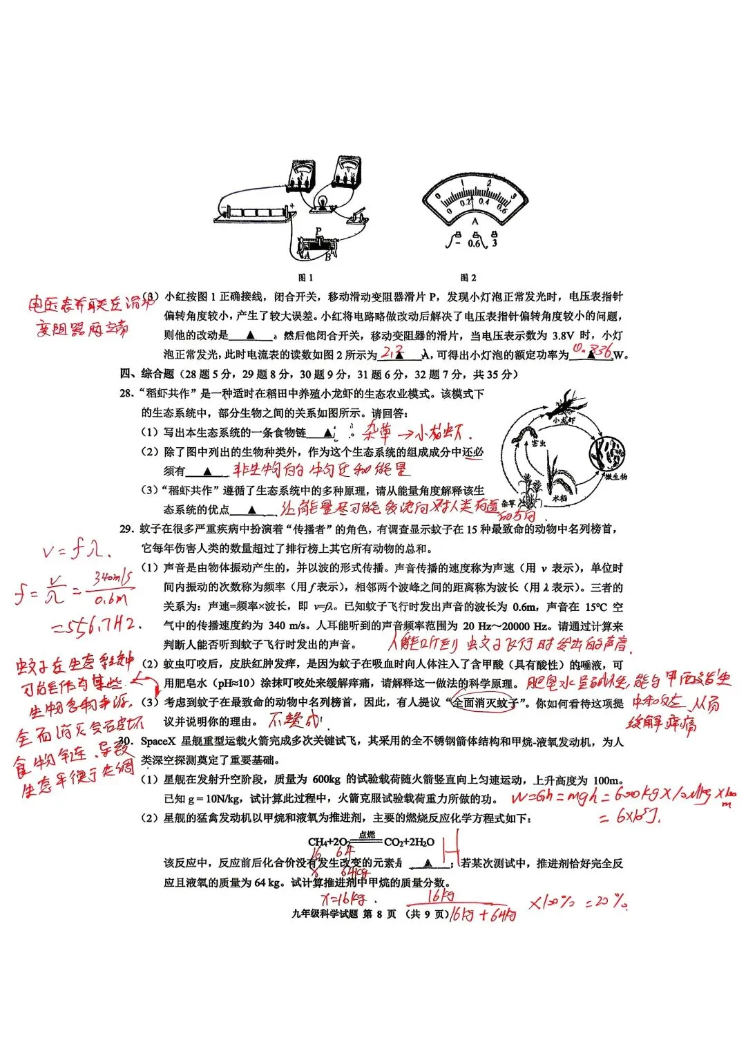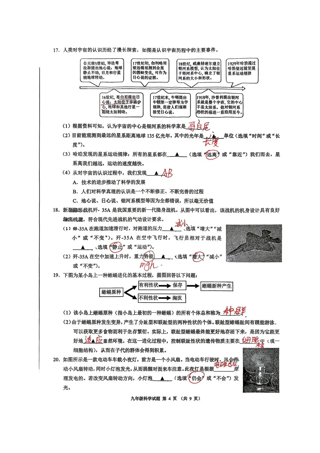 中考科学一模杭州新碶统考试卷手写答案分析
